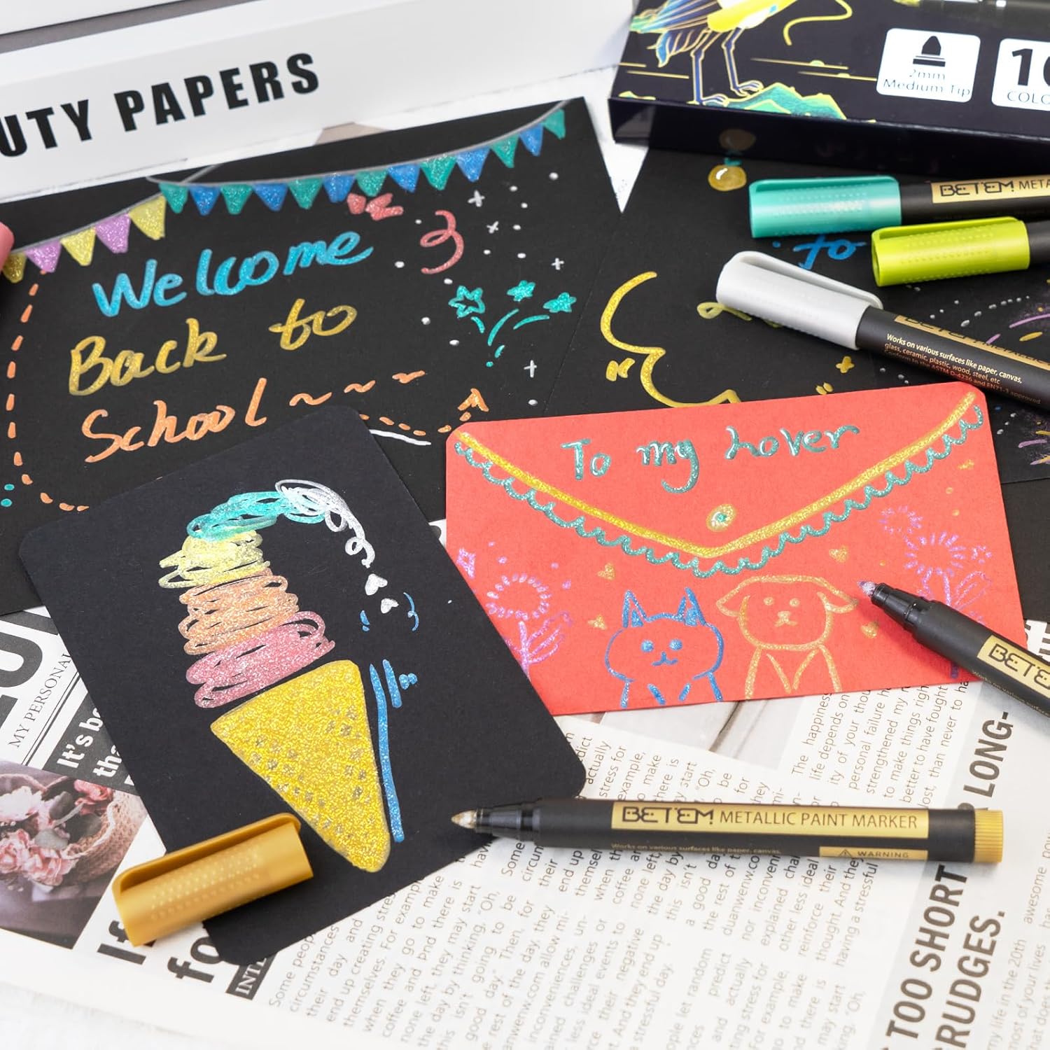Betem Metallic Paint Markers, 10 Colors Acrylic Paint Metallic Markers for Black Paper, 2mm Medium Tips Glitter Pens Scrapbooking Supplies, Pumpkin Painting Kit for Rock Painting, Cards, Photo Albums