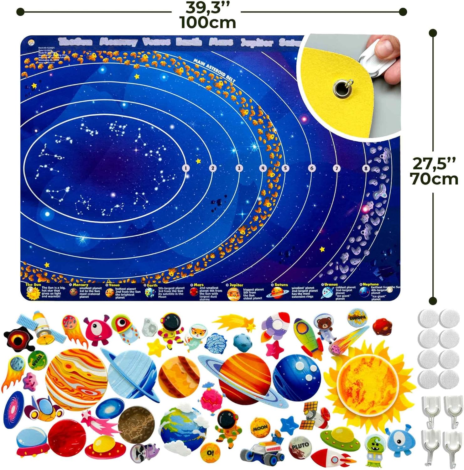 - SPACE-THEMED FELT BOARD: our space felt board for toddlers is designed to captivate and educate with its vibrant scenes and 61 velcro elements; these elements allow children to create endless stories, fostering creativity and critical thinking skills