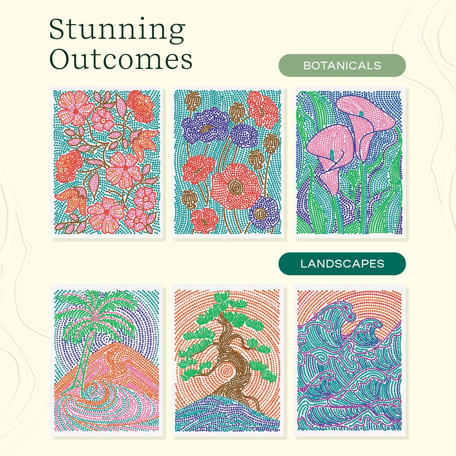 - PATENT PENDING, INNOVATIVE ACTIVITY PADS: Get into a calming flow state by dotting the letters on the page in a repetitive motion to form beautiful images. This Lifelines FlowArt 2-pack includes Dot-By-Letter Botanicals and Landscapes activity pads, each with 20 meditative scenes and 4 double-sided markers in a detachable storage tray.