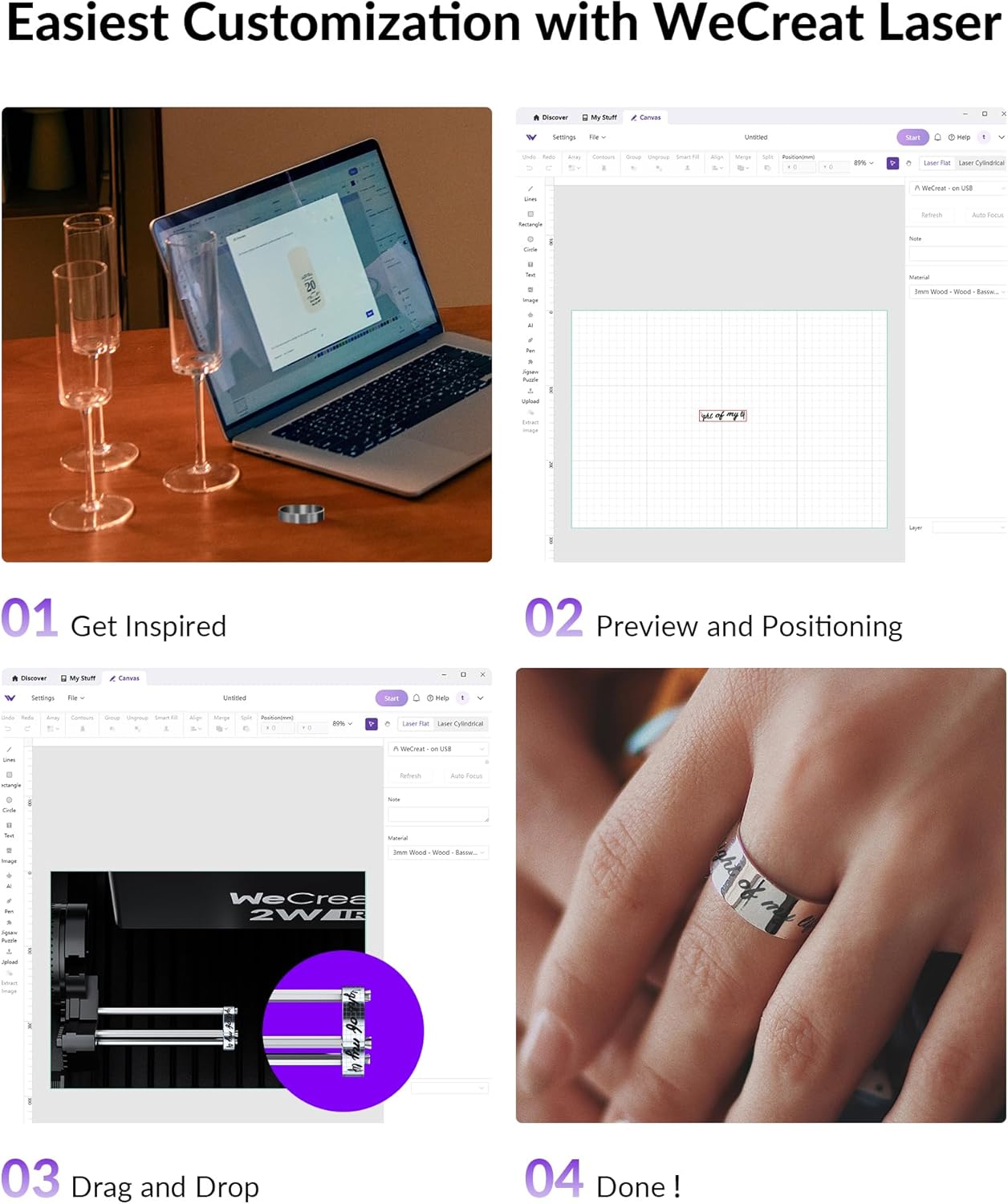 - [WeCreat MakeIt's New Look & Extensive Library]—Experience the best of both worlds – full compatibility with LightBurn plus an updated WeCreat MakeIt library packed with over 2000+ design projects, 500+ typefaces, thousands of SVG images, and weekly new additions. From Valentine's Day to weddings, Halloween to Christmas, the only limit is your imagination. Create custom gifts, earrings, art pieces, or even architectural designs – the Vista is your ticket to endless creativity.