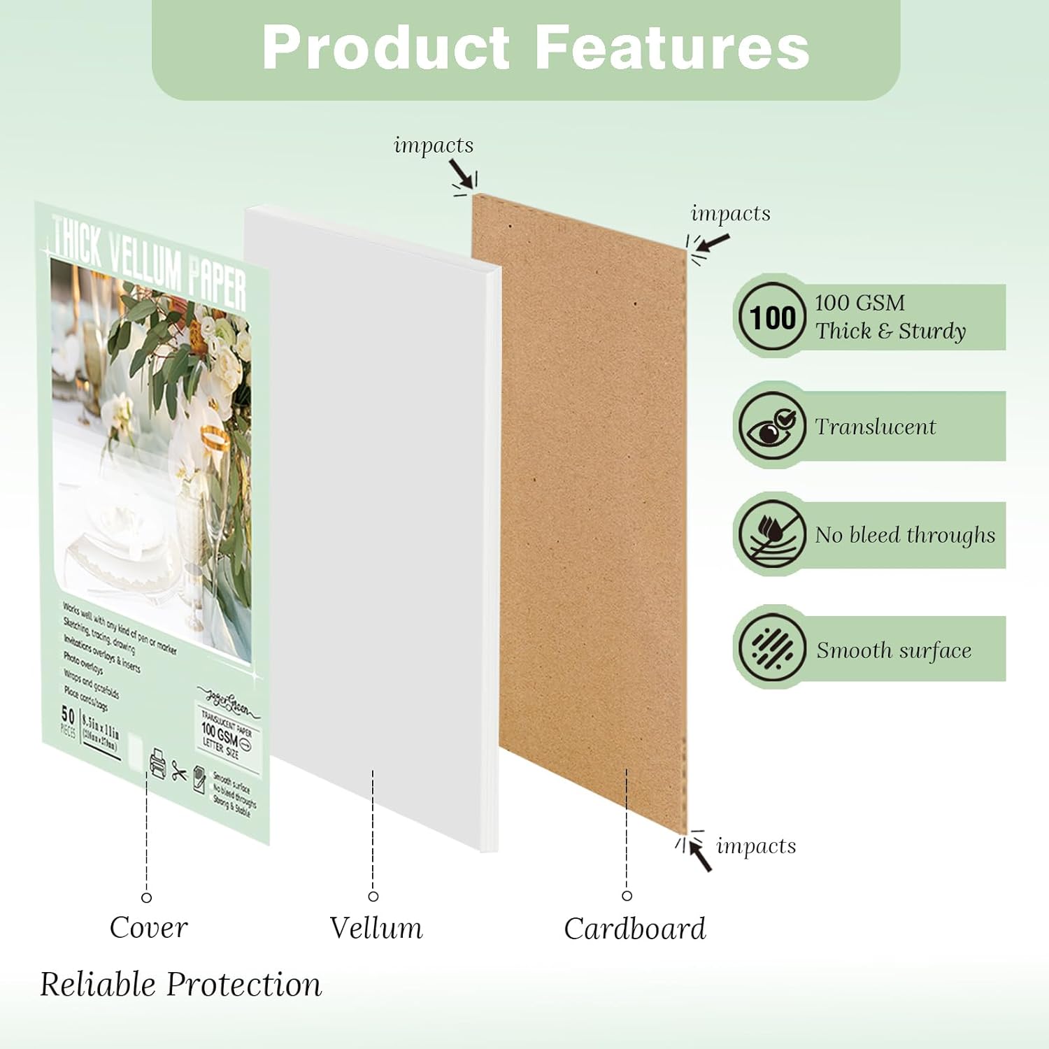 JAGERGREEN Vellum Paper 8.5 x 11 Inches 100GSM 50 Sheets, Thick Translucent Printable Vellum Paper for Invitations, Belly Bands, Tracing, Sketching