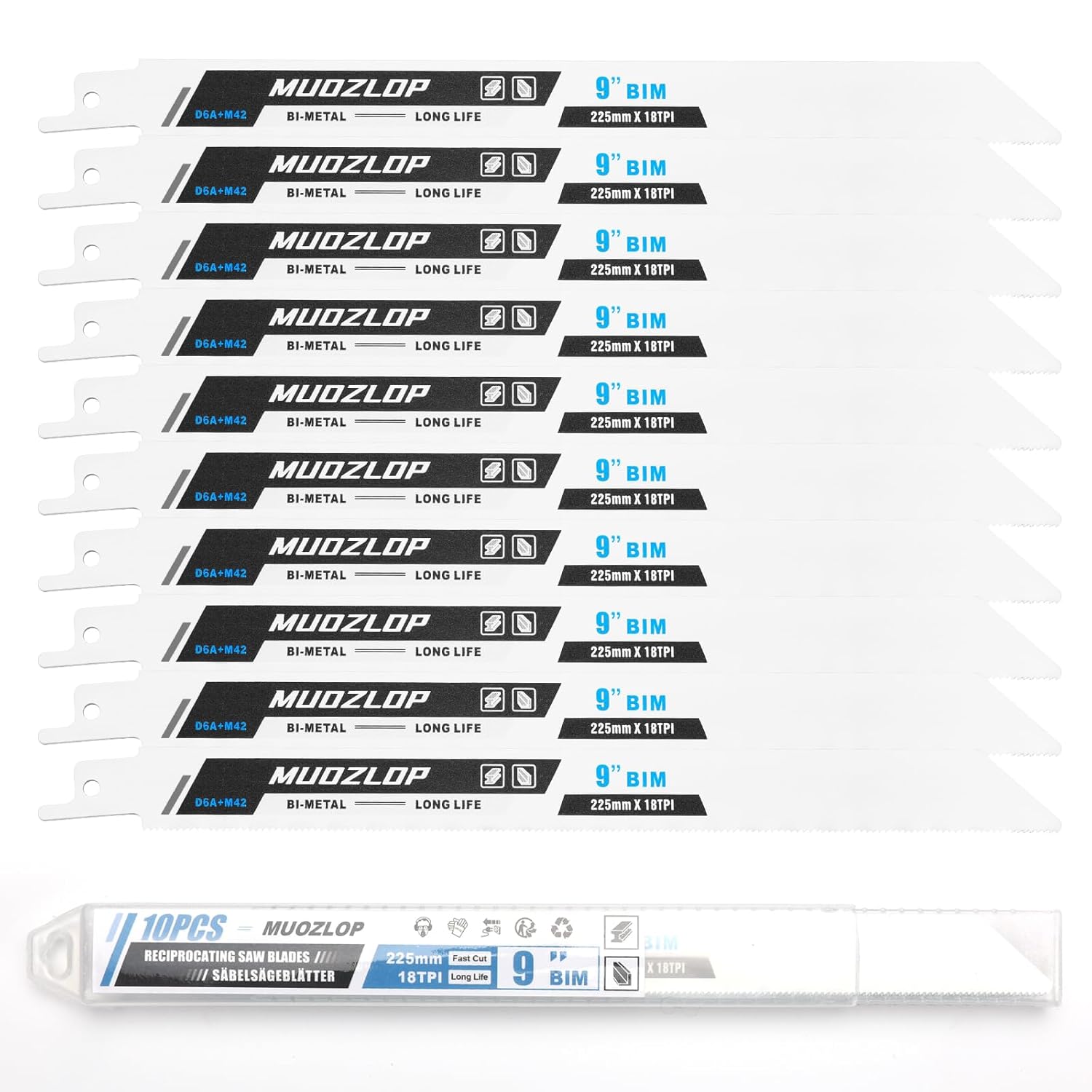 10 Pack 9 inch Reciprocating Saw Blades Set,18 TPI High Carbon Saw Blades, Metal Saw Blades with Organizer Case (10, 18TPI/225mm)
