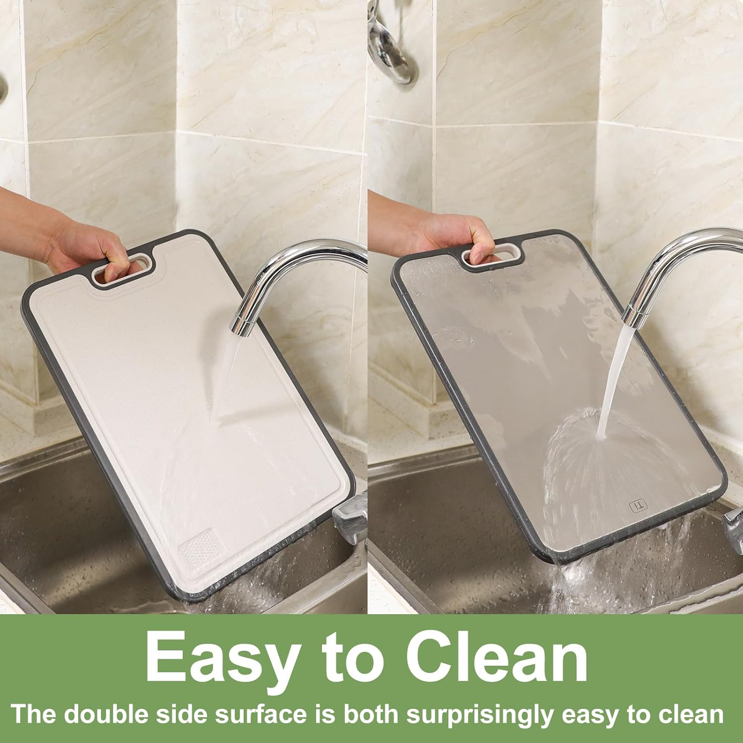 - Thoughtful Design: Chopping board with juice grooves that allow it collects liquids when cutting juicy items like tomatoes, Cleaning up after cooking will be a breeze with our cutting board