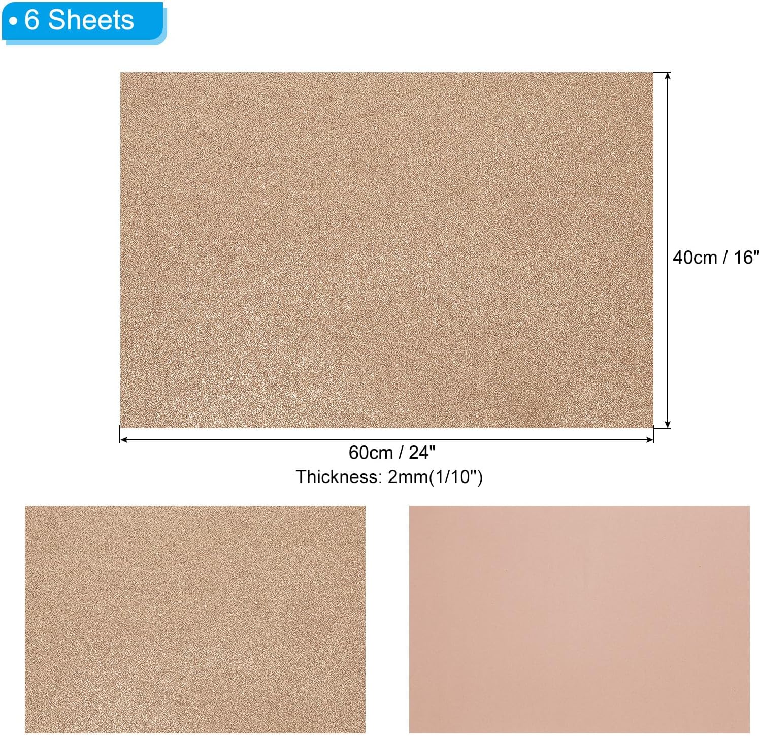 - Material: EVA; Color: Brown; Overall Size: 40x60cmcm / 16x24inch Inch; Thickness: 2mm / 0.08inch; Package List: 6 Sheets x Glitter Foam Sheet
