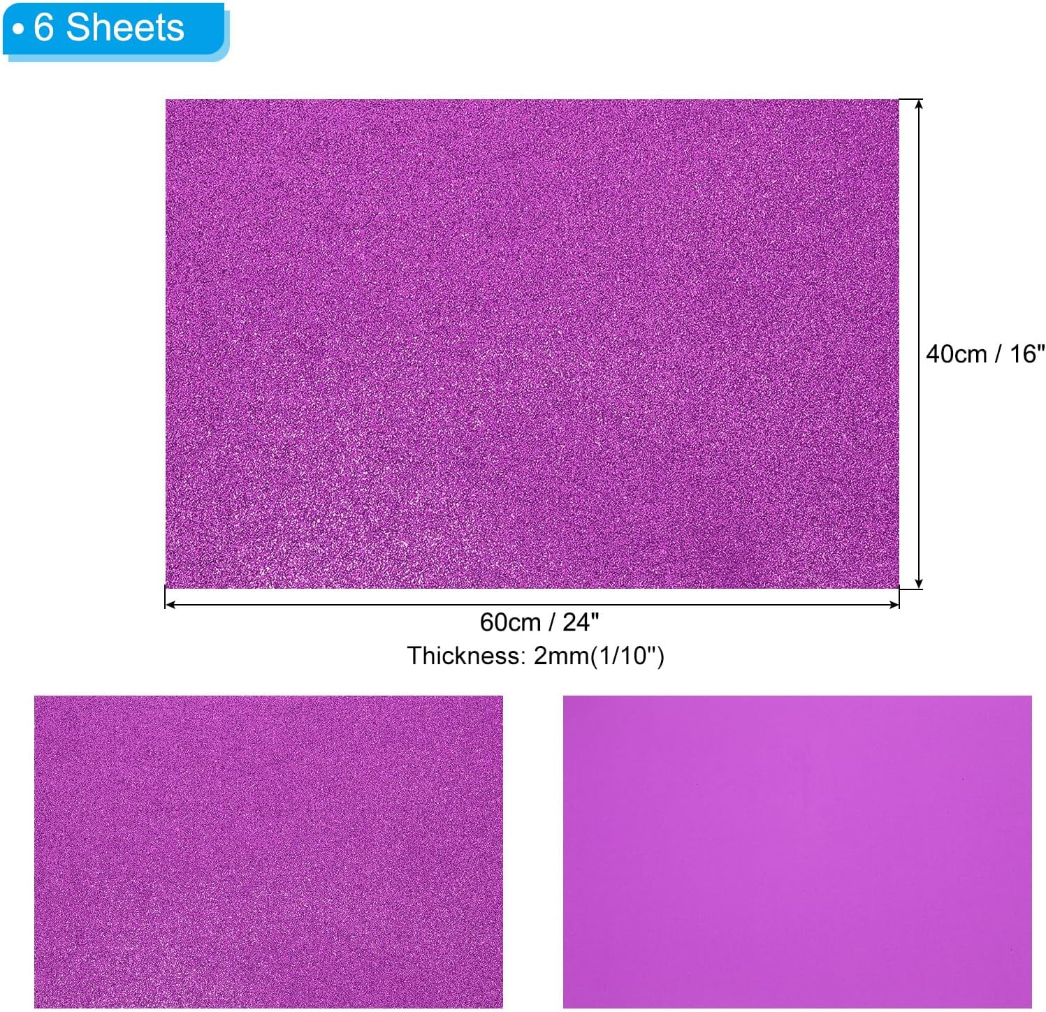 - Material: EVA; Color: Purple; Overall Size: 40x60cmcm / 16x24inch Inch; Thickness: 2mm / 0.08inch; Package List: 6 Sheets x Glitter Foam Sheet