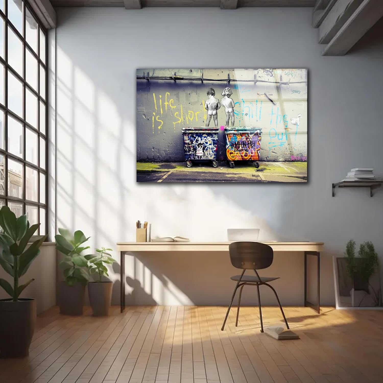 - Premium Tempered Glass: High-quality, scratch-resistant glass with a sleek, polished finish. This isBanksy Peeing Boys Life Is Short Printed painting printed on a high quality tempered glass comes with wall mount.