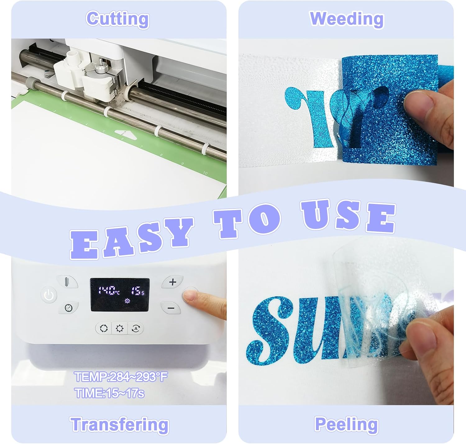 Glitter HTV Sparkly Heat Transfer Vinyl Bundle – 12 Assorted Colors 12"x10" Iron-On Vinyl Sheets for T-Shirts & DIY Crafts – Easy to Cut & Weed, No-Flake & Washable, Works with All Cutting Machines