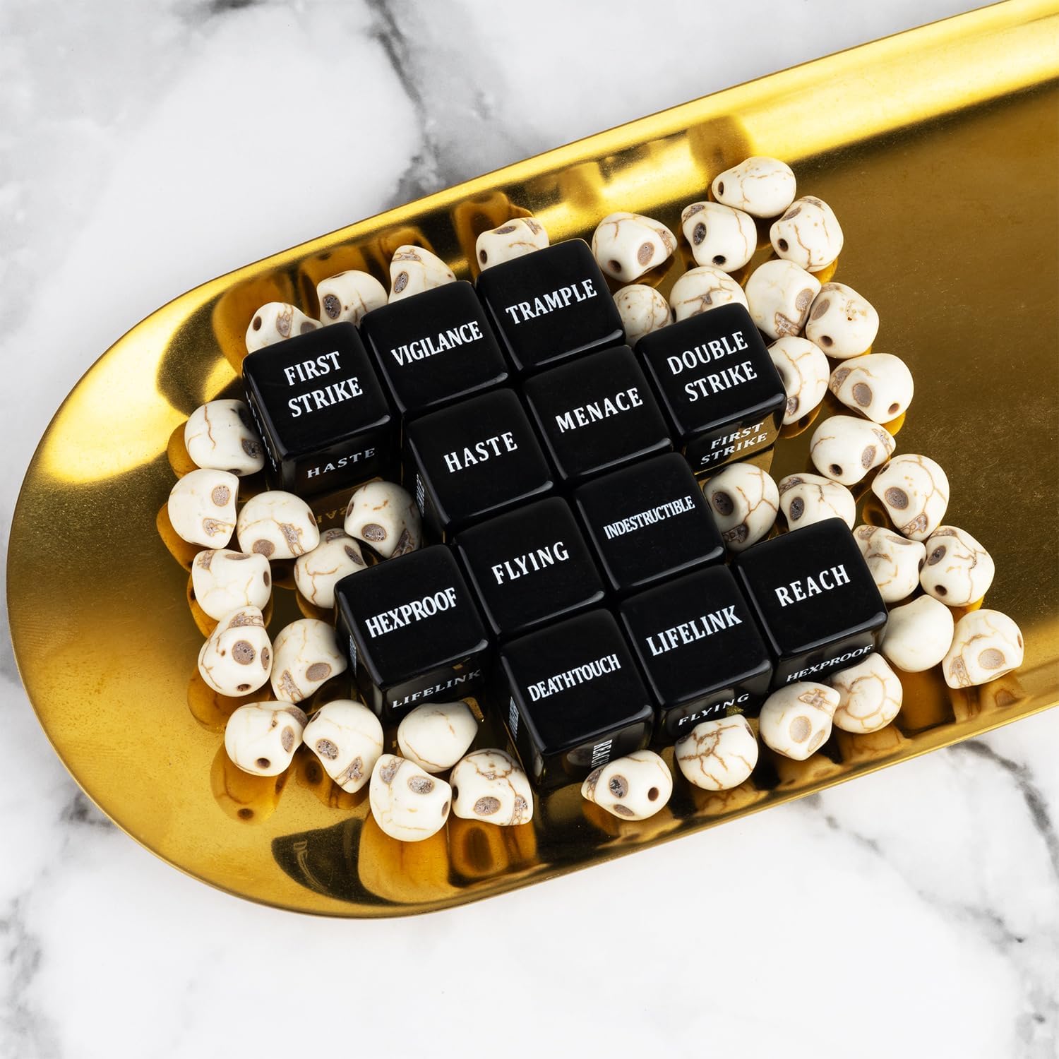 - Package Include: Total 24pcs black MTG keywords dice(FIRST STRIKE,DOUBLE STRIKE VIGILANCE,MENACE,TRAMPLE,HASTE / LIFELINK,REACH,FLYING,HEXPROOF,DEATHTOUCH,INDESTRUCTIBLE) and 24pcs dice counters(12 pieces green -1~-6 counters & 12 pieces red +1~+6 counters) with velvet pouch.