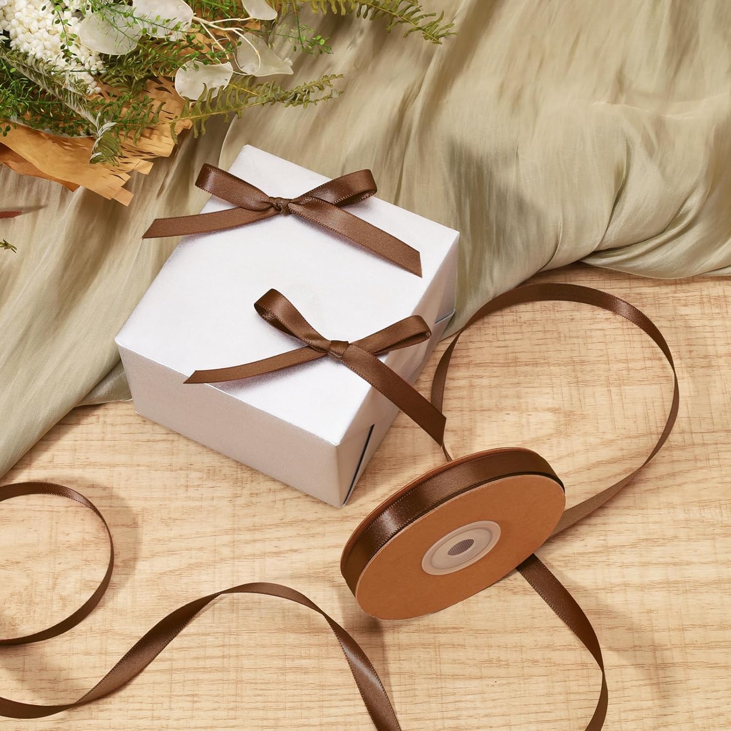 LaRibbons Brown Satin Ribbon 3/8 Inch 50 Yards Thin Luxury Double Faced Mocha Mousse Silk Ribbon for Flower Bouquet Crafts Gift Wrapping Wedding Decoration