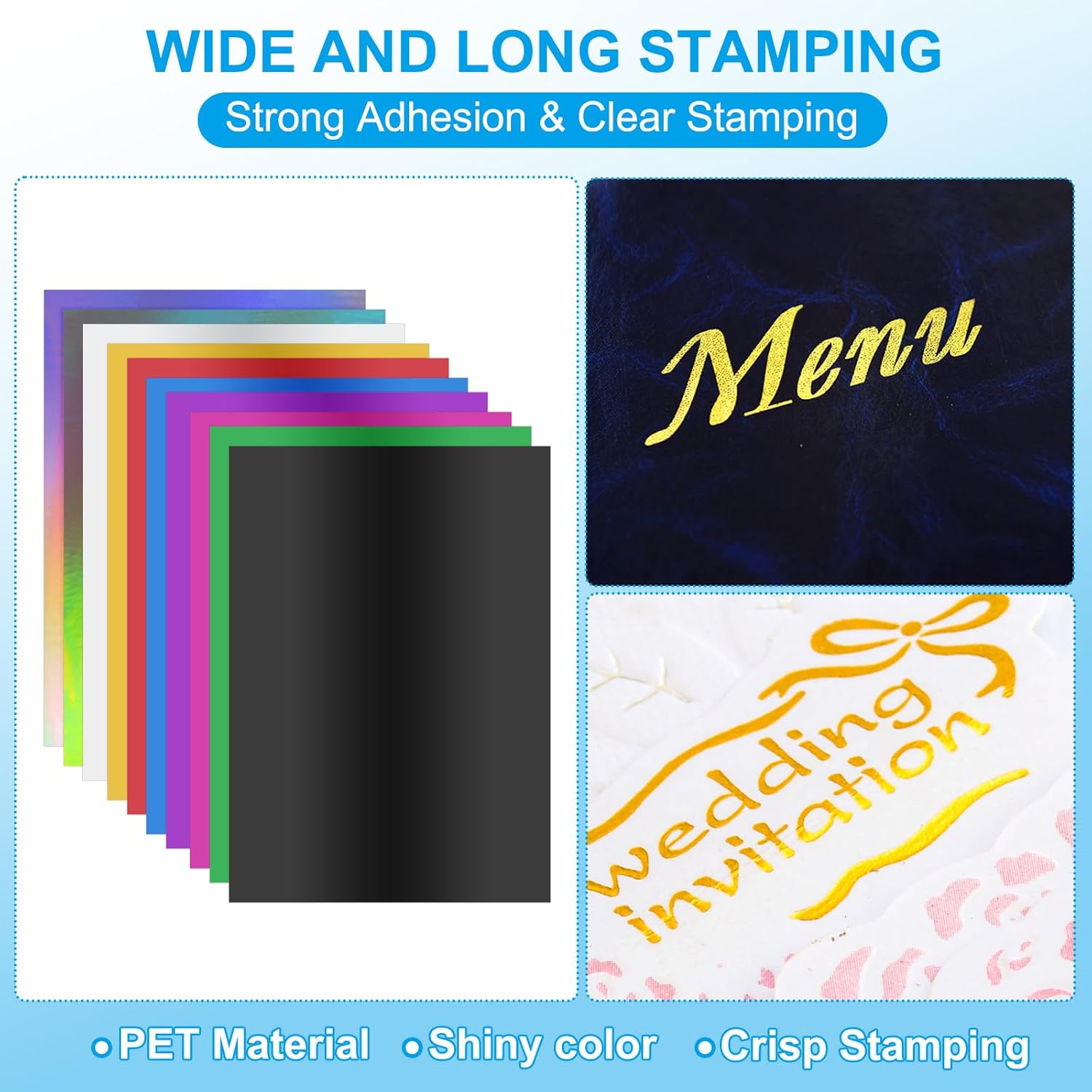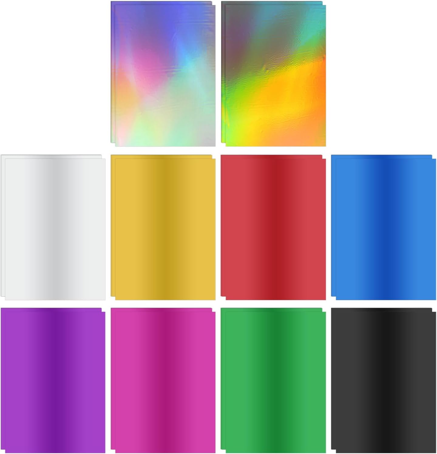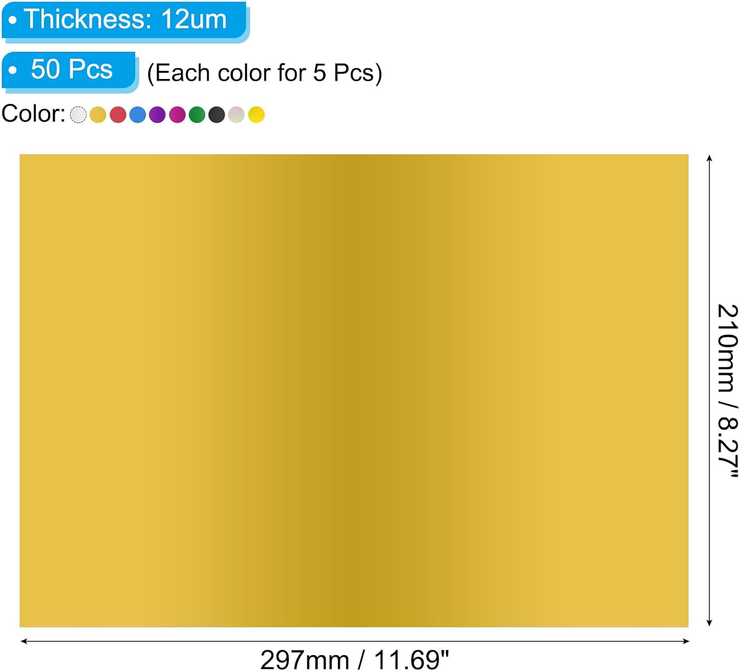 - Specification: Color: Gold/Silver/Red/Blue/Purple/Rose Red/Green/Black/Laser Silver/Laser Gold; Size: 297 x 210mm / 11.69 x 8.27 inch (L*W); Paper Thickness: 12um; Material: PET Plastic; Packing list: 50 Sheets x Hot stamping foil paper
