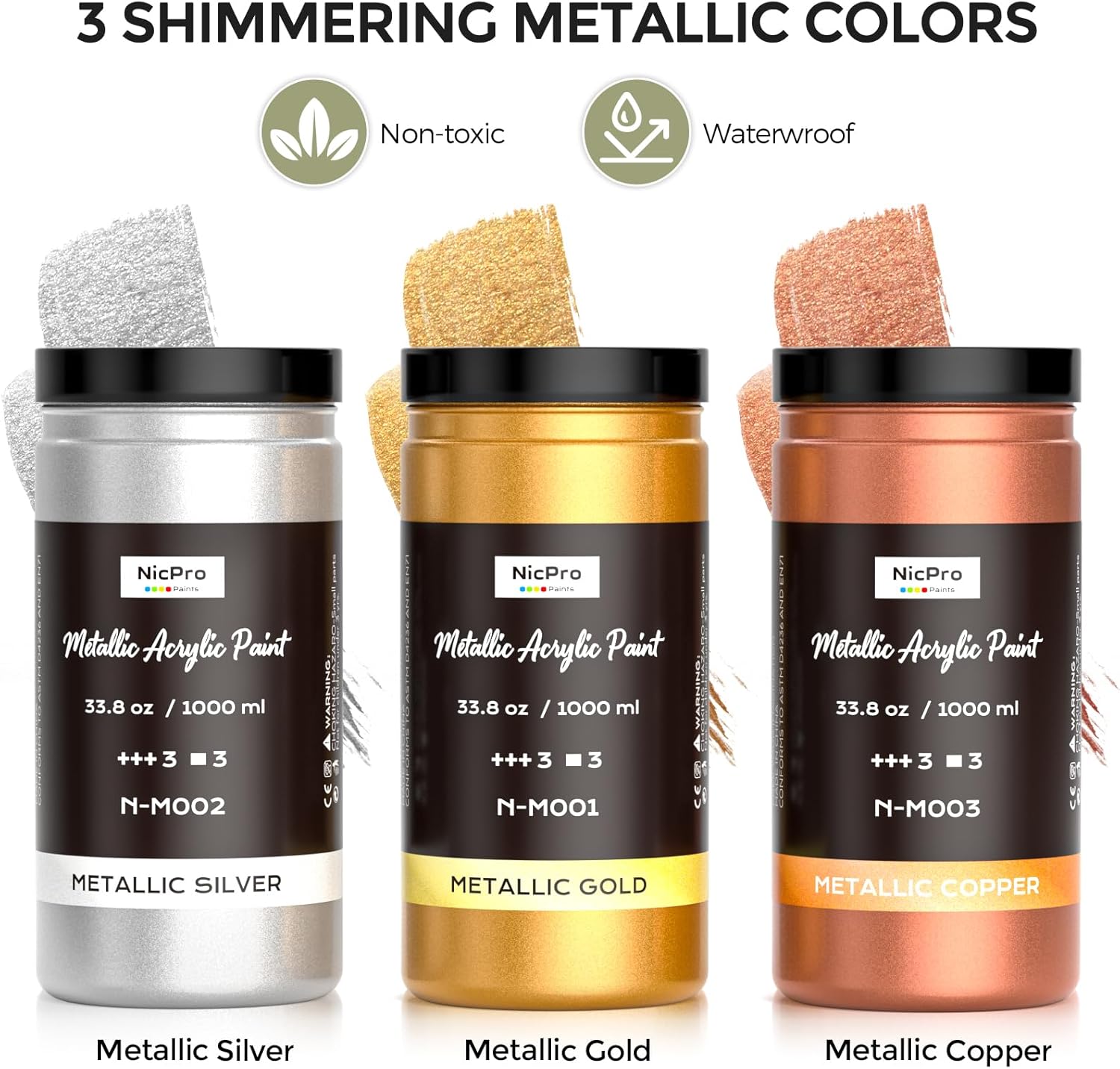 Nicpro Large Acrylic Paint Metallic, 3 Colors Gold, Silver, Copper 101.4oz/3000ml Gold Leaf Paint, Non Toxic, Non Fading for Art Painting, Handcrafts, Multi-surface, Canvas, Wood, Clay Metal Furniture