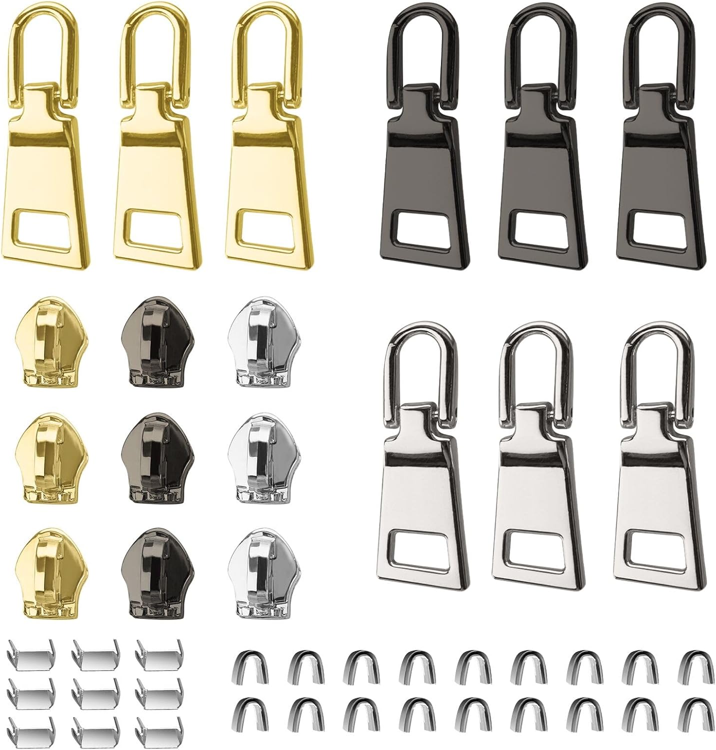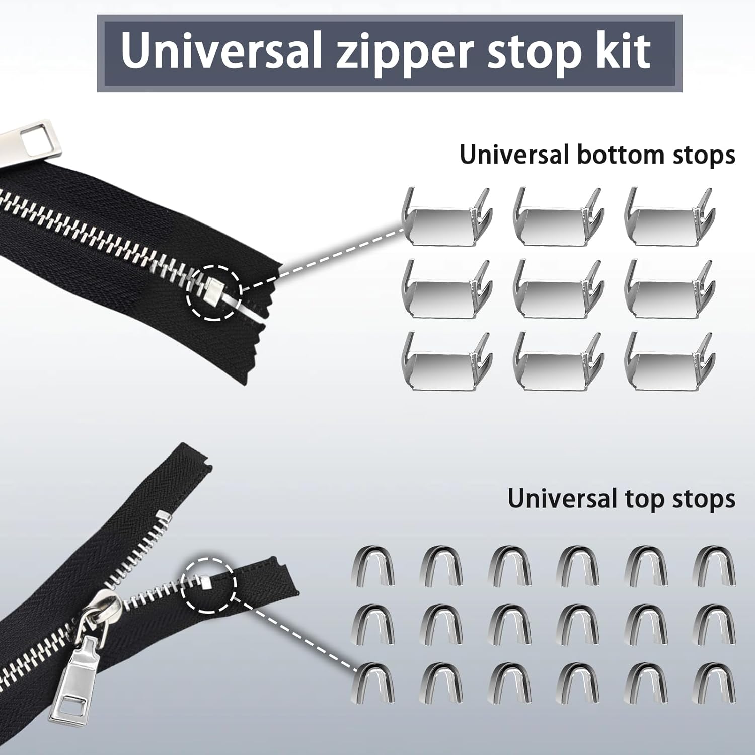 - Great Value Package: This zipper repair kit not include pliers and ONLY suitable for #3 zippers. The fix zipper repair kit included: 3 x metal zipper head(gold, gray, silver), 3 x plastic zipper head(gold, gray, silver), 3 x nylon/coil zipper head(gold, gray, silver), 3 x gold zipper pull, 3 x gray zipper pull, 3 x silver zipper pull, 18 x top zipper stops, 9 x bottom zipper stops. Confirm your zipper type and size before purchase please