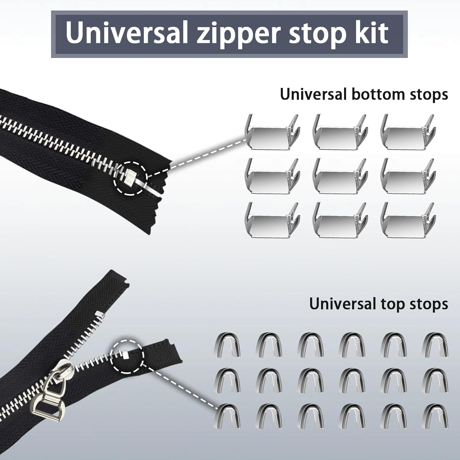 - Great Value Package: This zipper repair kit not include pliers and ONLY suitable for #3 zippers. The fix zipper repair kit included: 3 x metal zipper head(gold, gray, silver), 3 x plastic zipper head(gold, gray, silver), 3 x nylon/coil zipper head(gold, gray, silver), 3 x gold zipper pull, 3 x gray zipper pull, 3 x silver zipper pull, 18 x top zipper stops, 9 x bottom zipper stops. Confirm your zipper type and size before purchase please