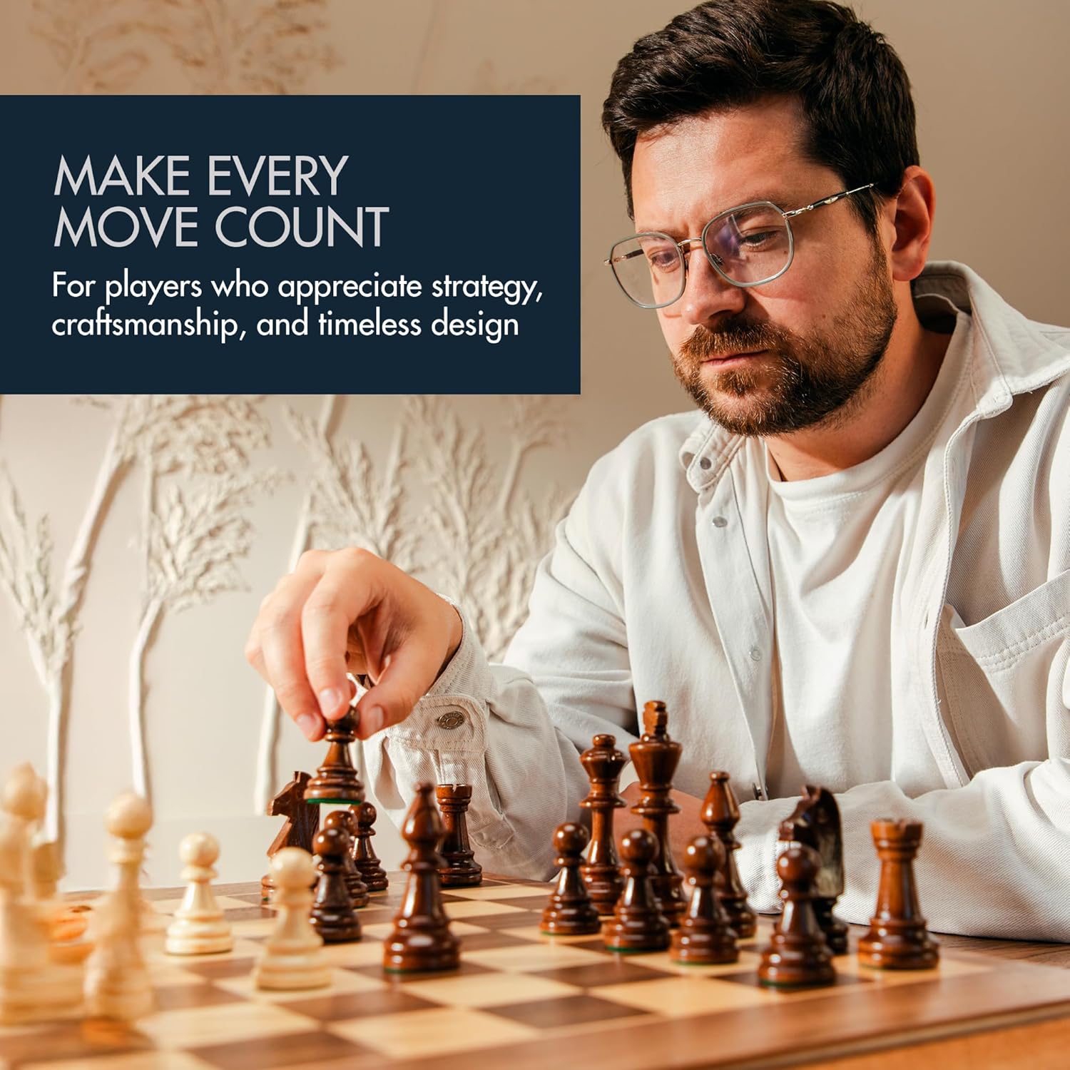 - Crafted to Impress: The Walnut and Maple inlay and solid Acacia Wood frame complete with large weighted chess pieces and premium acrylic checkers and dice. This luxury chess set makes this set an heirloom to last generations