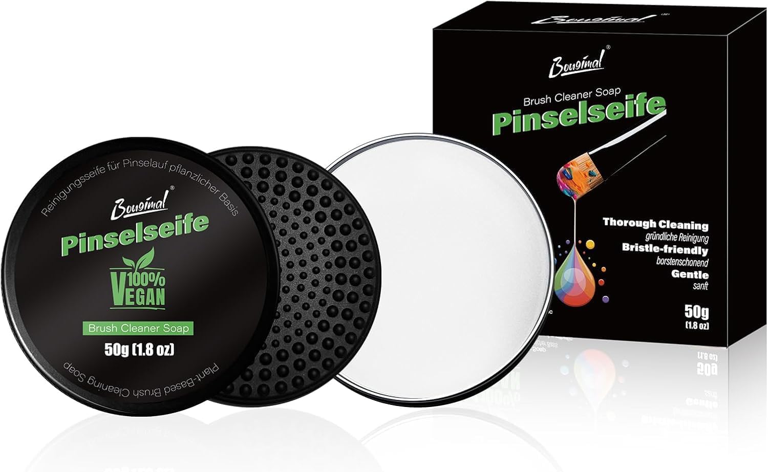 - Portable and Gift-Ready: The Bougimal paint brush cleaner soap set includes a 1.8-ounce soap bar, perfect for long-term use. Packaged in durable metal tins and elegant black paper boxes, it prevents drying and makes an artistic gift for painters and makeup enthusiasts alike. A must-have cleaning tool for beginners and pros!