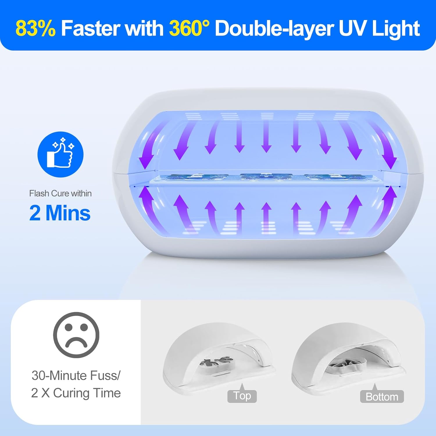 - Dual-Layer Power – Cure Both Sides at Once: Unlike traditional single-sided uv light for resin, our dual-layer UV resin light uses 56 LEDs (28×2-layer) for top and bottom coverage—no flipping needed, even for thick resin or intricate resin molds.Cuts curing time by at least up to 50%, boosts efficiency, and ensures uniform, bubble-free results in every layer.
