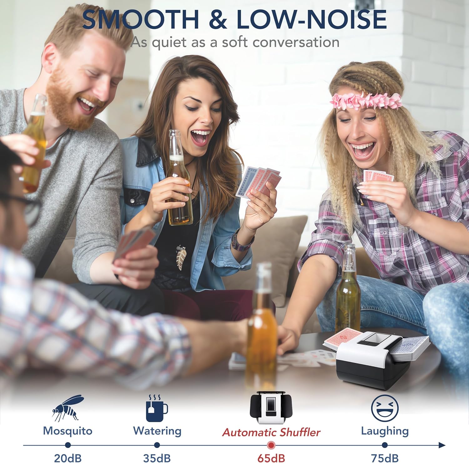 - LOW NOISE SHUFFLING - The Automatic Card Shuffler Machine distinguishes itself from other electric shufflers through its use of superior materials. It operates with minimal noise, guaranteeing a serene and pleasurable gaming atmosphere. Robust and long-lasting, this high-end device is designed for enduring performance, delivering an impeccable gaming experience on every occasion.
