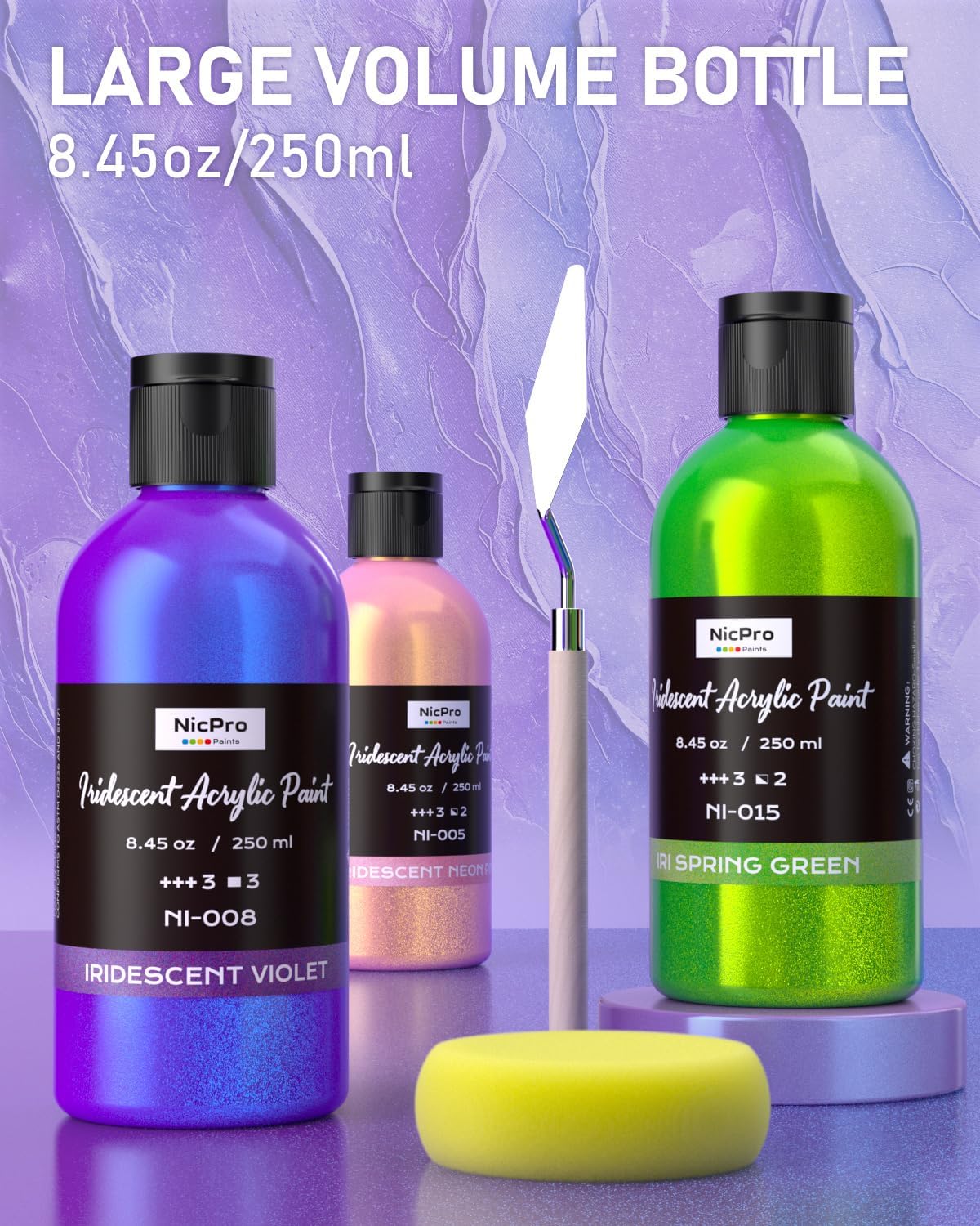 - Non-Toxic & Easy to Use - Nicpro acrylic paint conforms to ASTM D-4236 and EN71 standards, non-toxic and acid-free, safe for both kids and adults. This iridescent paint comes in leakage-proof flip-top bottle, very convenient to store and use. First choice for artist, painter, craft making and Halloween decoration