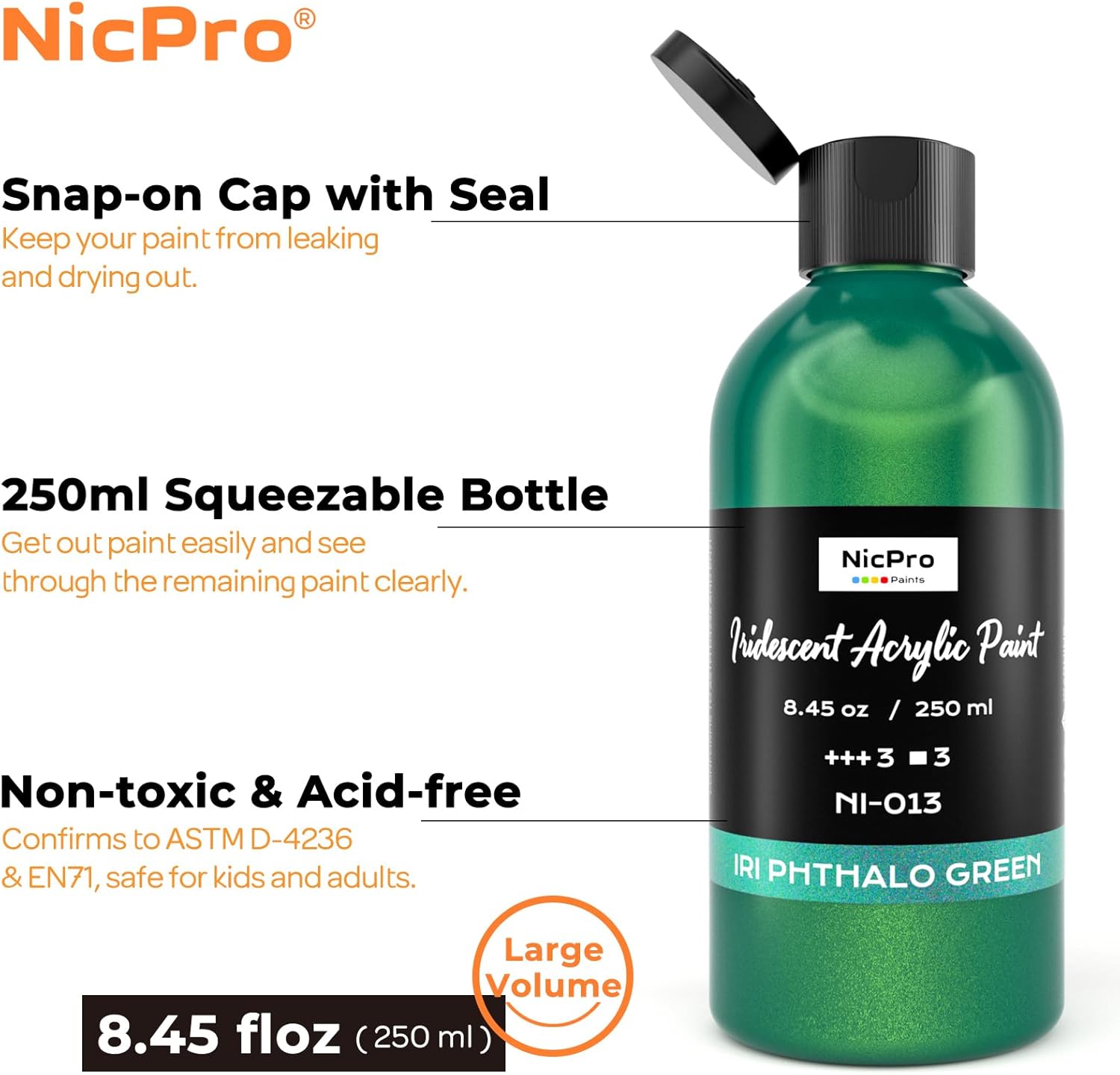 - Non-Toxic & Easy to Use - Nicpro acrylic paint conforms to ASTM D-4236 and EN71 standards, non-toxic and acid-free, safe for both kids and adults. This iridescent paint comes in leakage-proof flip-top bottle, very convenient to store and use. First choice for artist, painter, craft making and Halloween decoration