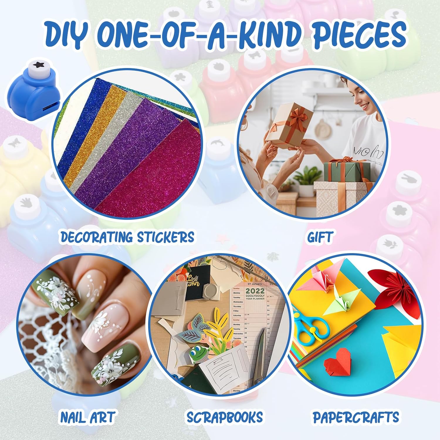 - Widely use: Paper punches for crafting can use for decorating stickers, lovely edges, etc; Great to decorate gift cards, nail art, scrapbooks and other papercrafts. It can inspire your creativity to DIY one-of-a-kind pieces. And it's a perfect day gifts.