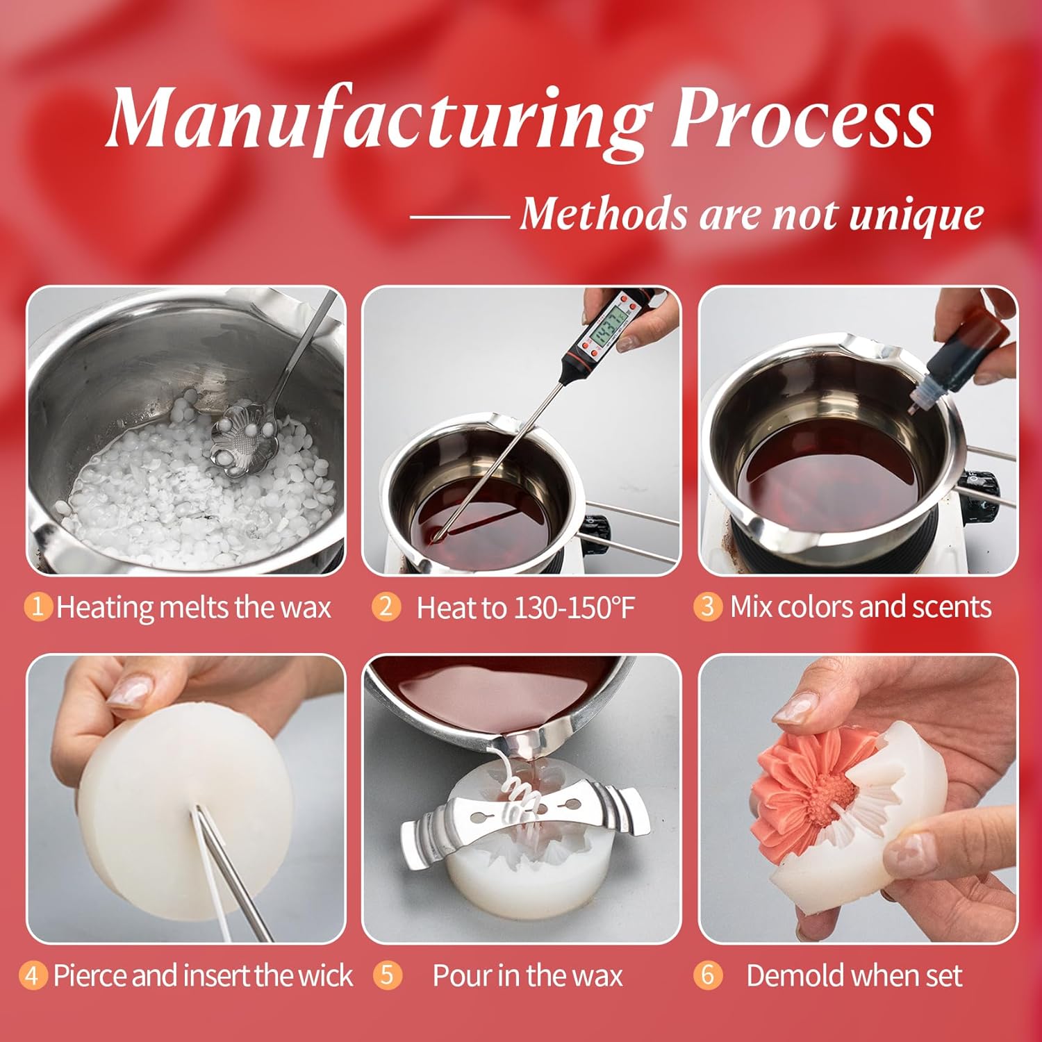 - 【Easy to Use】Fix the wick firmly, melt the wax material and add fragrance and pigment as needed. Pour the wax liquid into the mold when it reaches the appropriate temperature. After it cools and solidifies, demold it, and then trim the wick and the edges of the candle.
