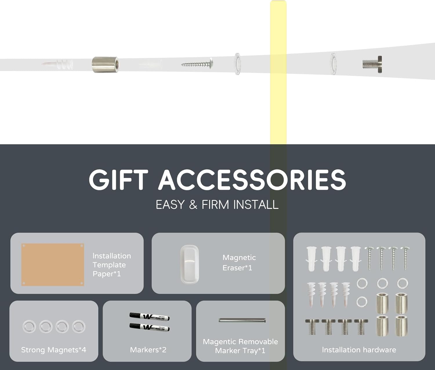 - Effortless Installation: Installing your glass whiteboard is a breeze with our comprehensive mounting kit and step-by-step instructions. The pass-through mounting system allows you to secure the board vertically or horizontally, providing flexibility to fit your specific space and needs.