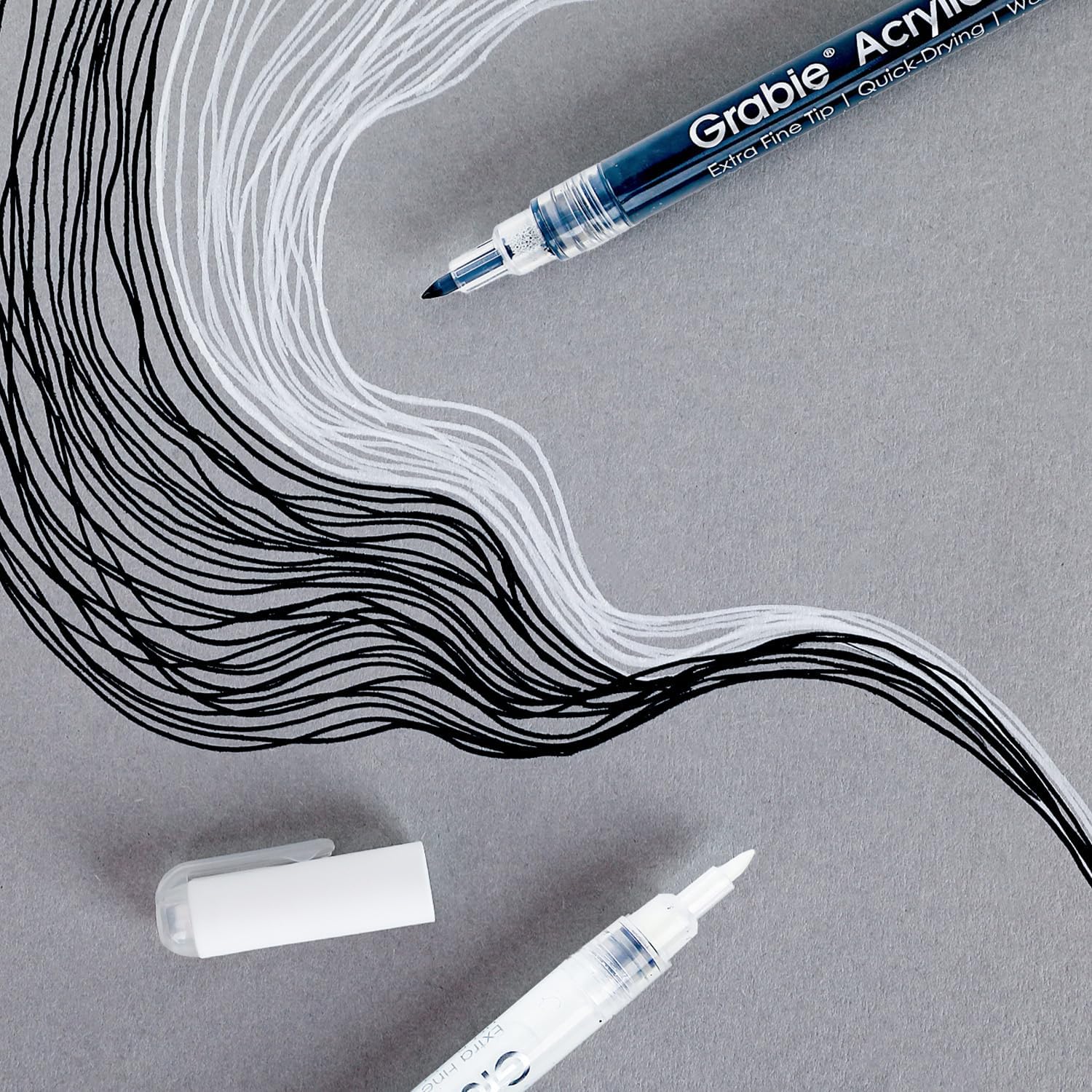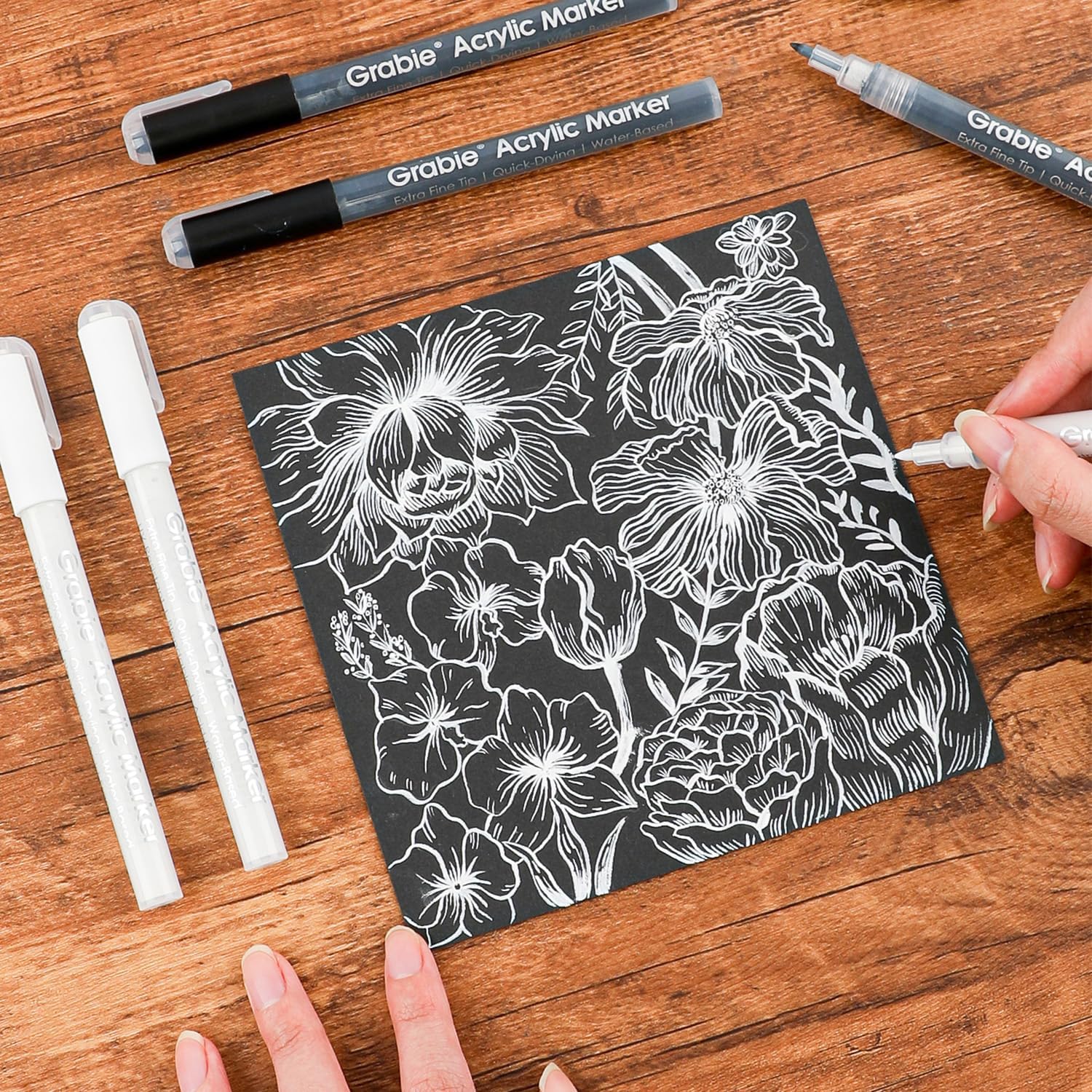 Grabie Black&White Extra Fine Tip Acrylic Paint Marker Set, 6 Pack, 0.7mm Acrylic Paint Pens for Highlights, White Highlight Markers