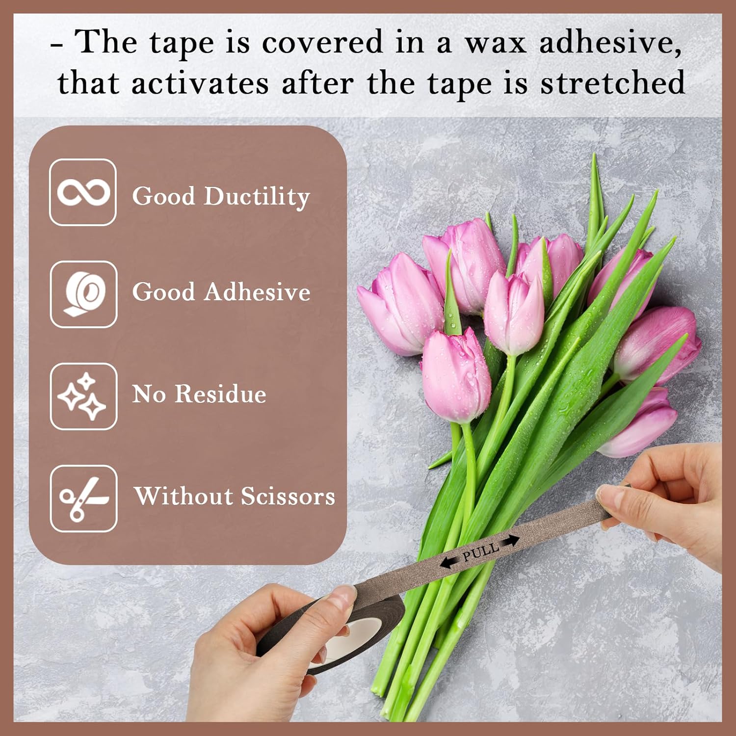 - Usage Tips: With a wax adhesive coating, this flower tape activates upon stretching, allowing for easy tearing by hand to swiftly bond flower stems and create bouquets. The floral tape adheres solely to itself and is not of the self-adhesive variety