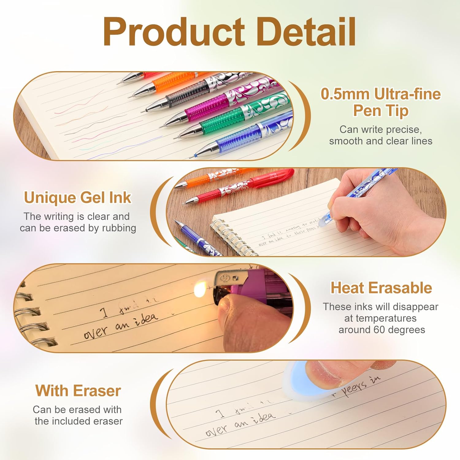 - Advantage: 1. Our heat erasable gel pens use a unique gel ink that is clear in color and will disappear with erasing friction. These inks are erasable at temperatures around 60 degrees, and when you quickly touch the iron, you will see the markings disappear without any residue. 2. With a 0.5mm ultra-fine pen tip, our erasable gel pen allows you to write precise, smooth, clear lines. The markings of the fabric marking pen are visible, not easy to confuse, and easy to measure and cut