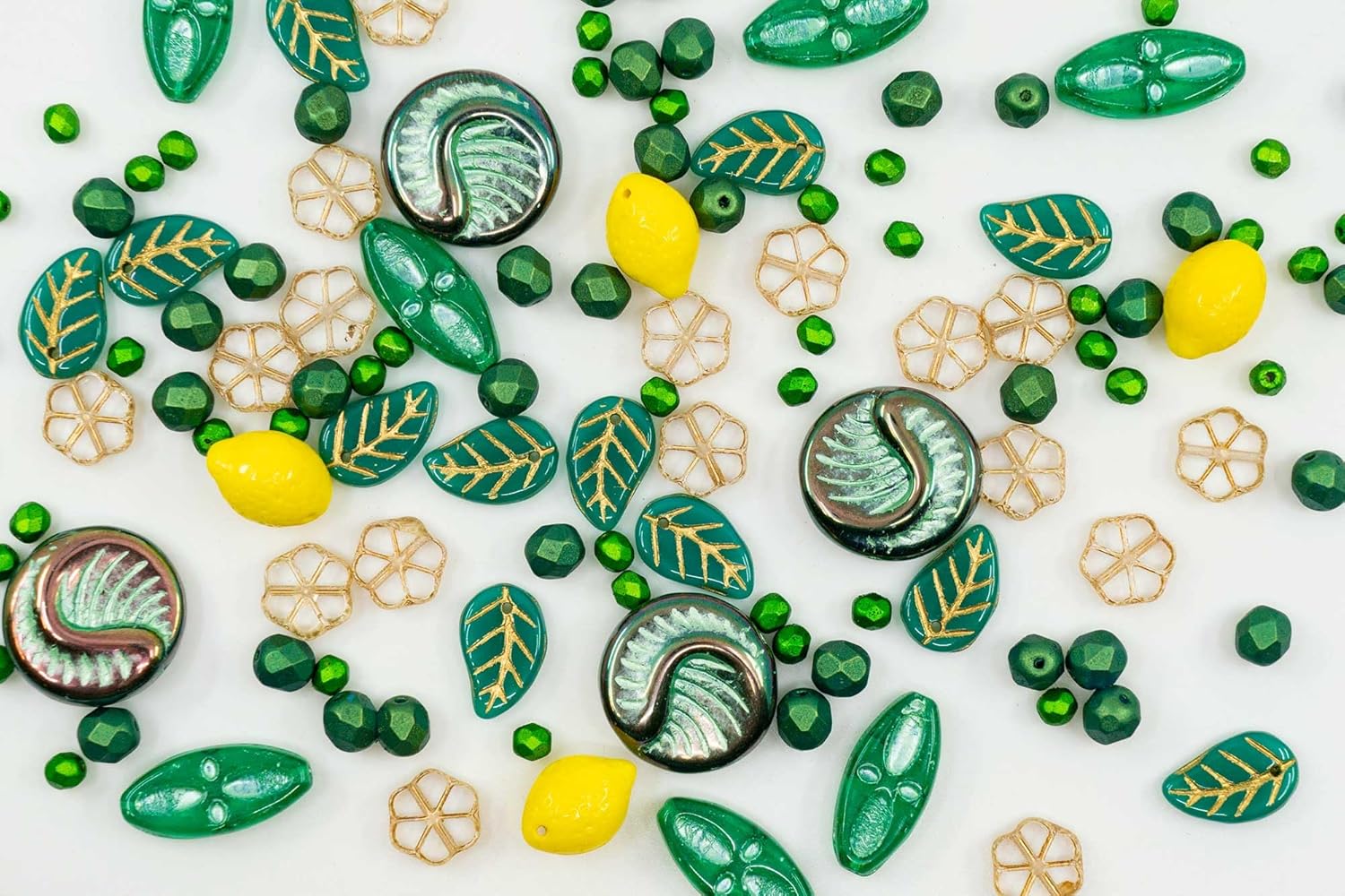 2.1oz (60g) of Focal Czech Glass Bead Mix with Lemon Shaped Beads, Seashel Beads and Leaf Beads, Emerald