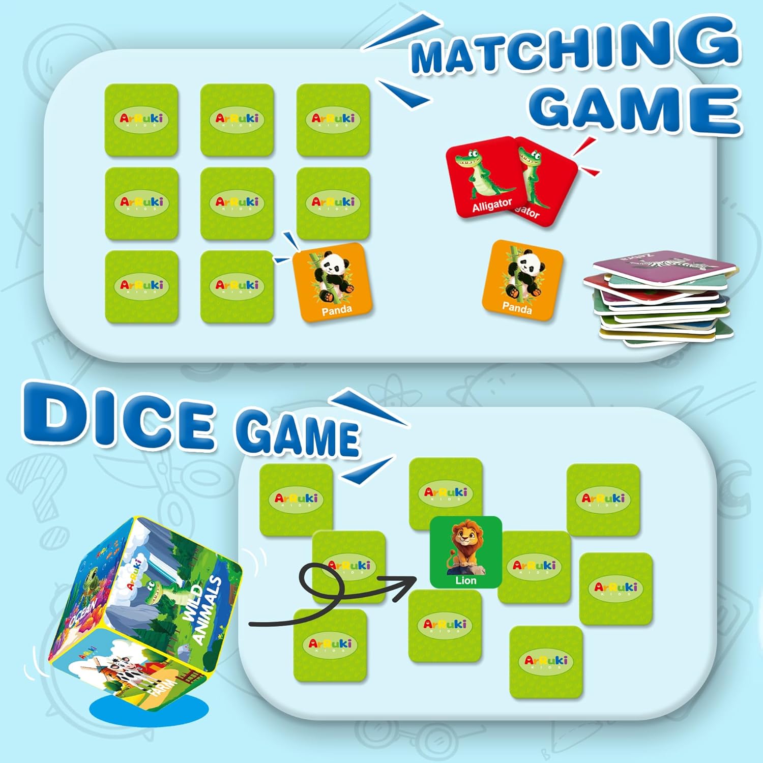 - 7 Game Design--1. standard match 2 cards 2. Roll the dice, flip a card, keep the match 3. Flip the card and match to the game board 4. Match the shadows to the card for the toddlers 5. Memory recall 6. Guess the animal on the card 7. Story telling where player 1 flips a card and says a sentence with the animal, then player 2 ties in tho the story, and so on.