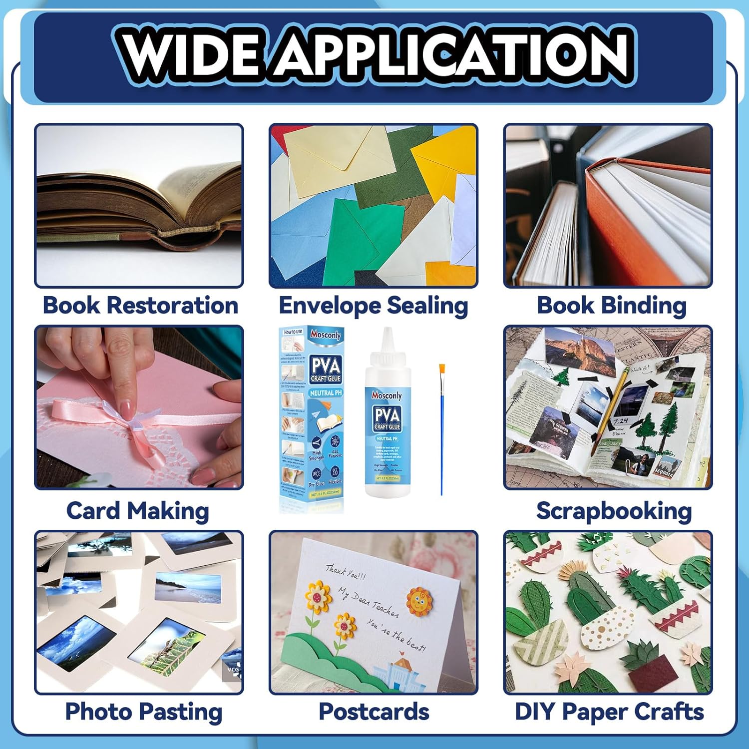 - Archival Grade PVA Adhesive: This PVA adhesive features a neutral pH formula, ensuring it is safe for use on paper and perfect for book repair, bookbinding, and DIY handcrafting. With excellent bonding strength and lay-flat properties, this glue adheres seamlessly to most porous surfaces. It remains durable even when bonding irregular or deformed materials, making it a reliable choice for all your craft projects