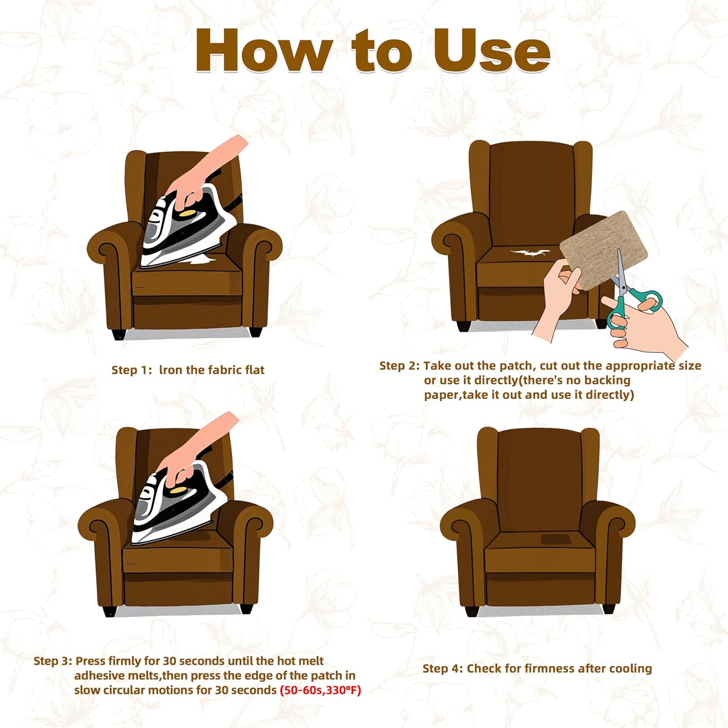 - Easy to use: Use scissors to cut out the size or shape you need to repair. Place the patch in the area you need to repair, then press the fabric patch with an iron and heat it about 5-10s. Simple repair to make the fabric patch firm and free of residue.