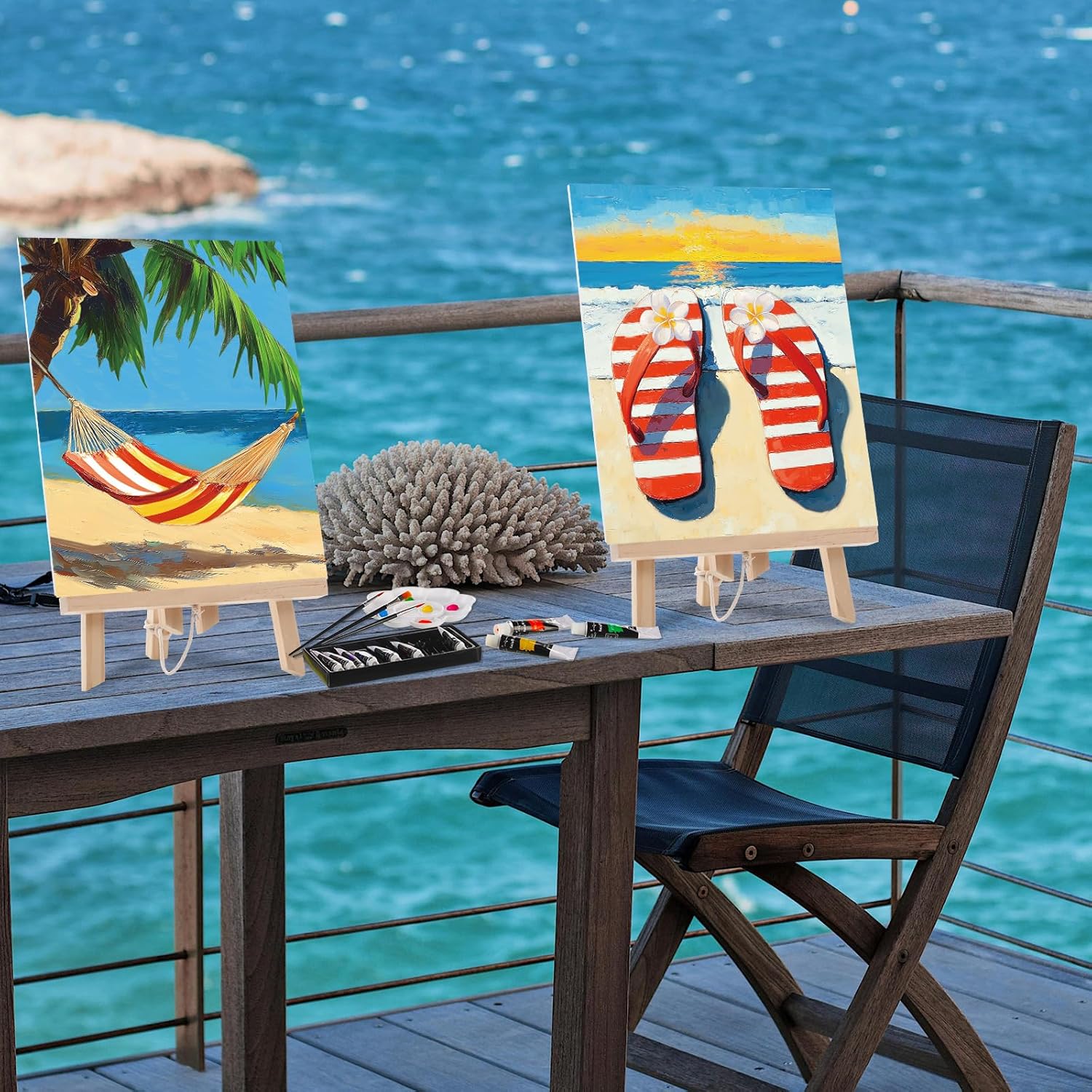 - Extensive Pre Printed Canvases Set: a total of 8 pre printed canvas, with 8 different well designed patterns; Comes with 12 reference color matching cards corresponding to the pattern; 2 packs of acrylic paint set, each pack contain 12 different colors; 2 pcs wooden easel holders; 8 packs of paintbrushes, 3 per pack, including 3 different pen and 8 pcs of white paint trays