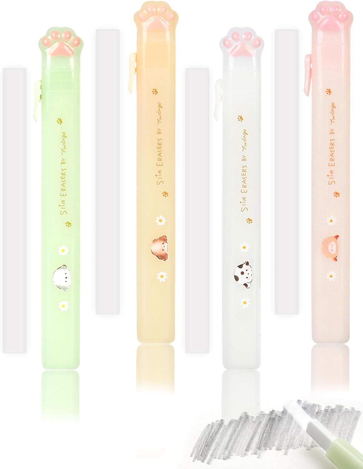 Benvo Retractable Cat Paw Erasers 4 Pcs with Refillable Rubbers Slim Erasers for Precise Erasing, Cute Eraser for Students, Artists, Office Use