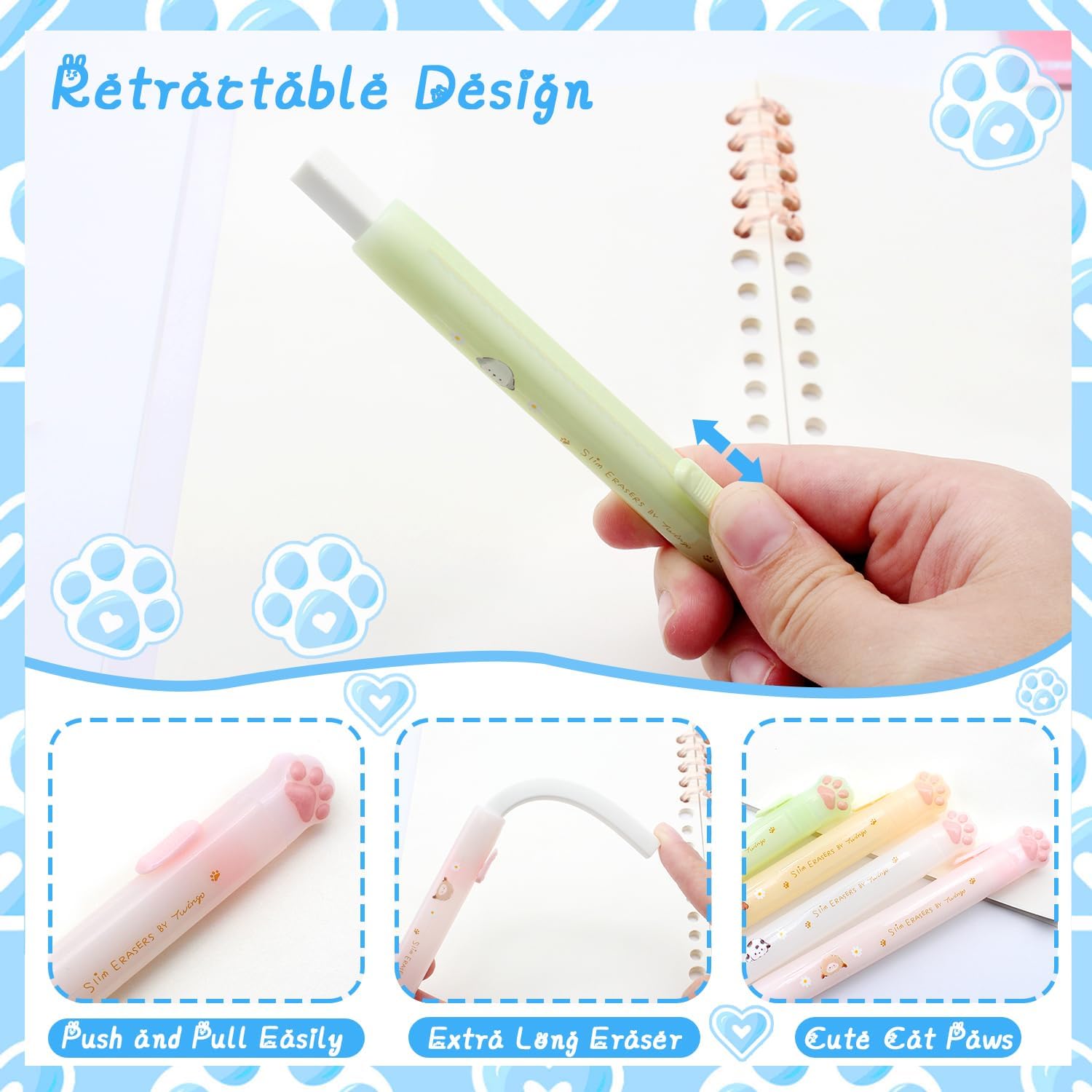 - Refillable Design- These pull and push cat paw erasers comes with 4 refillable cores, ensuring you always have a fresh eraser ready to go. Replace the eraser core when it wears down—simply slide out the old one and insert a new refill!