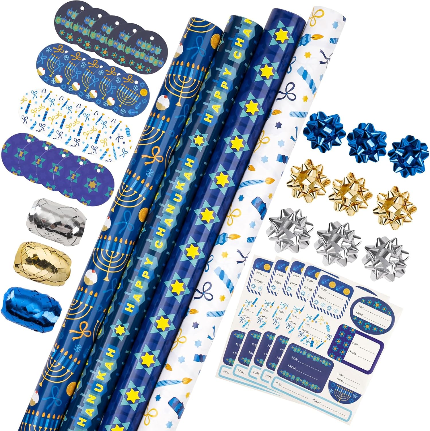- Package: The package includes 4 rolls Hanukkah wrapping paper (30"x120") with gridlines on the reverse; 9 are 3" gift bows(3 each of metallic royal blue/gold/silver), 20 are gift tags (4 designs, 5 each of design), 5 sheets gift stickers, 3 ribbons (3 Colors, 10M/Color), the coordinated set can meet your gift wrapping needs.