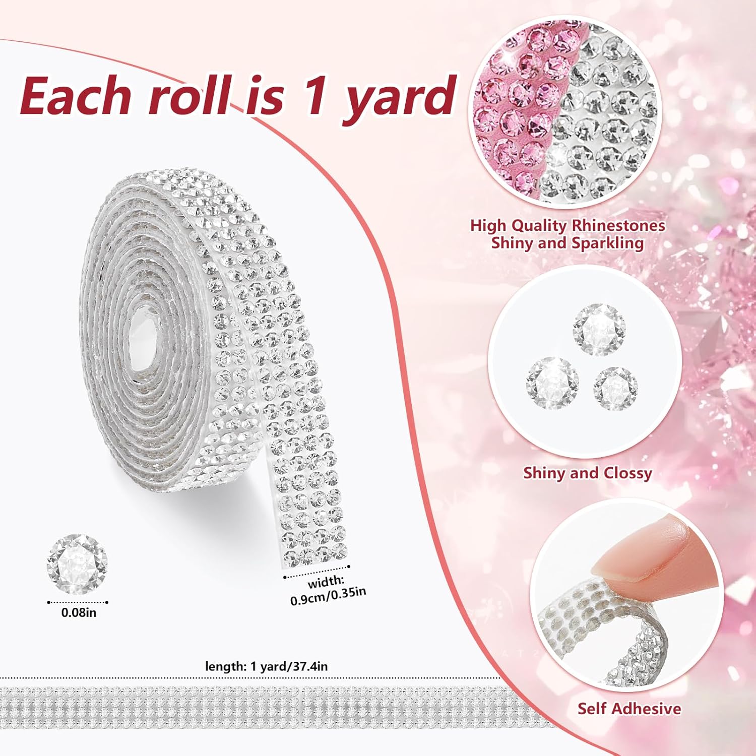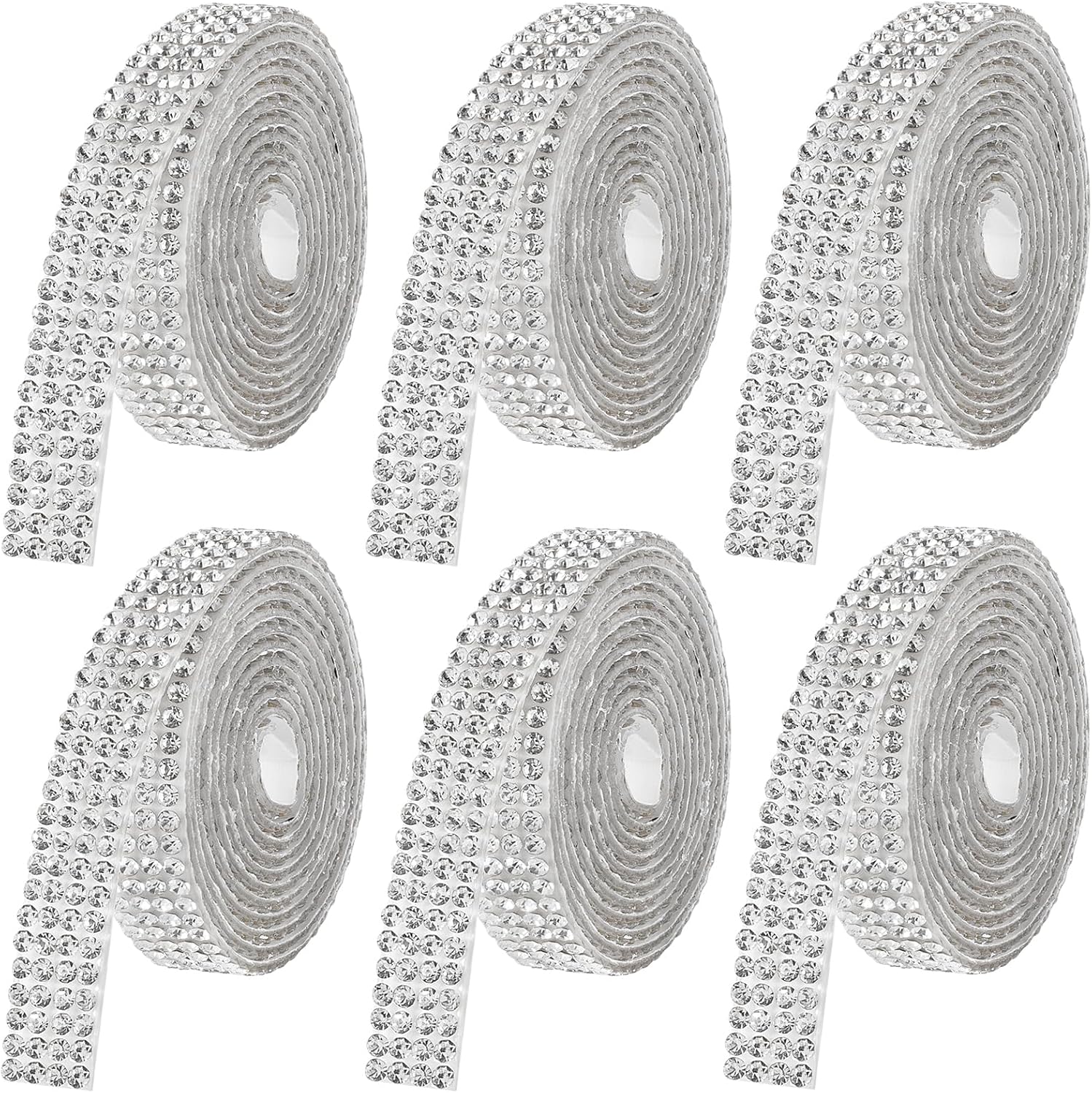 - 【6 Rolls Rhinestone Tape Self Adhesive】: Dive into the world of creativity and elegance with our Self Adhesive Crystal Rhinestone Ribbon, available in 6 transparent colors. Each roll measures 0.39 inches in width with four rows of sparkling rhinestones, spanning a length of 1 yard.