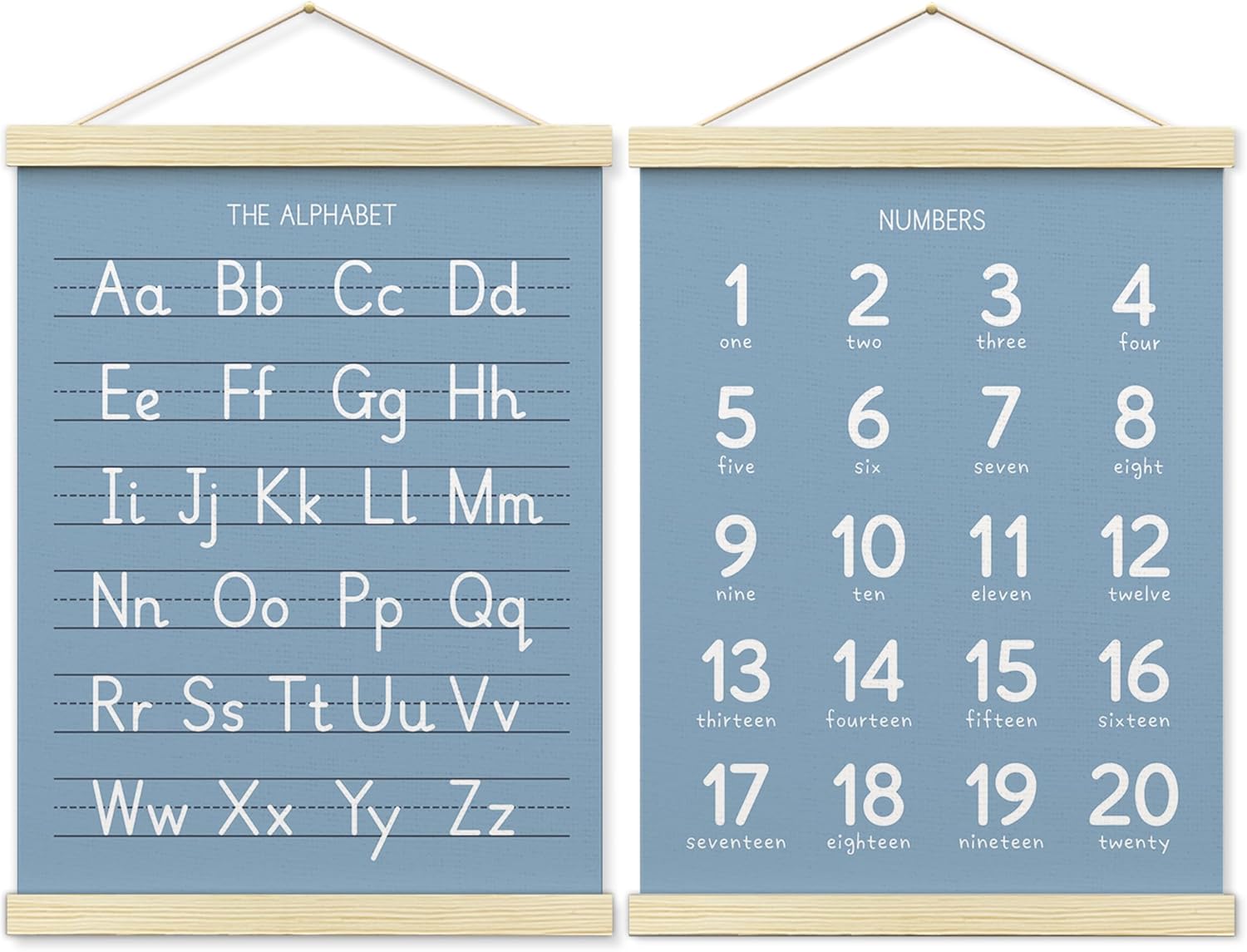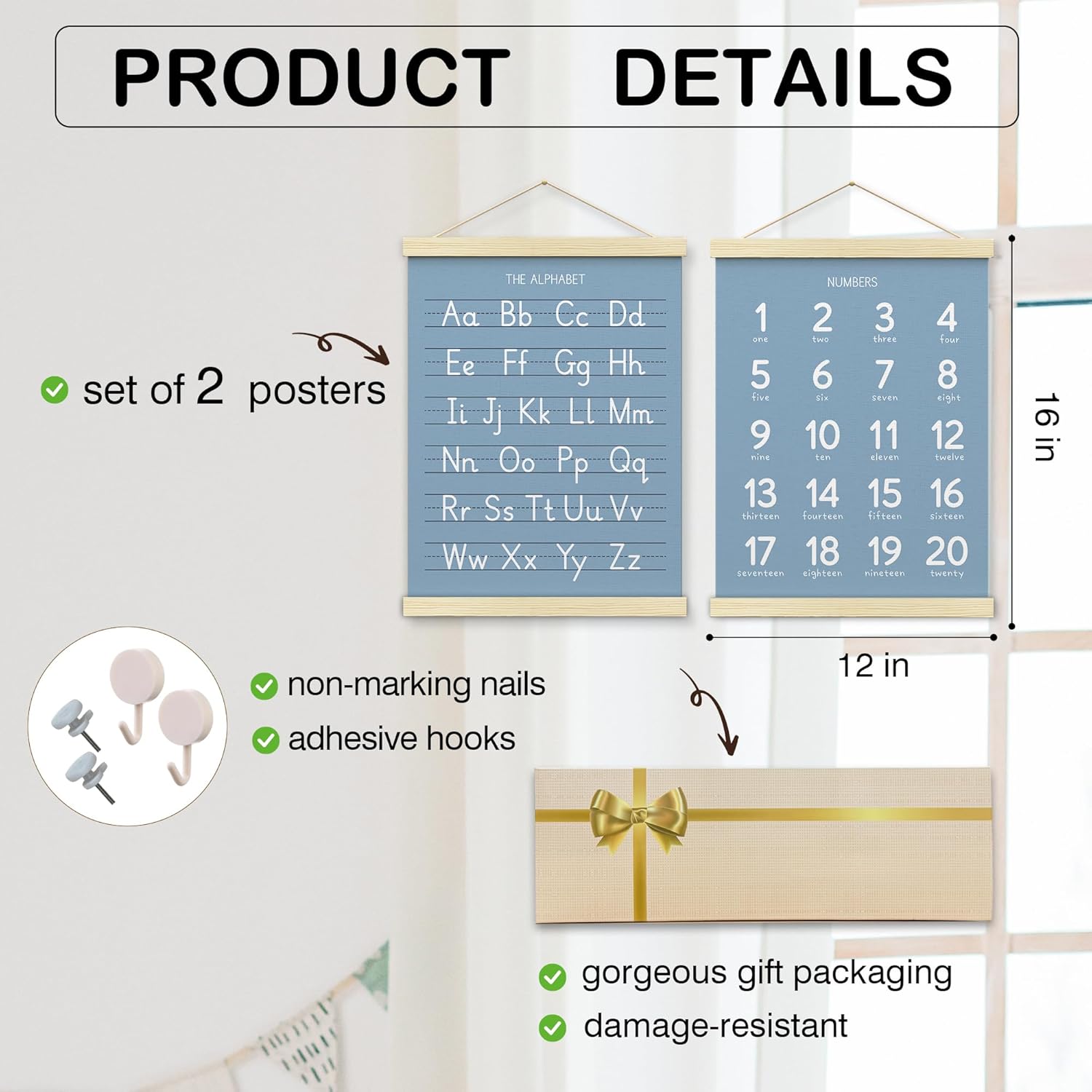 - Product Dimensions: Versatile 2 pieces per set 12 x 23 inches, alphabet banner a fun and toddler educational posters piece that features a canvas scroll with colorful ABC poster and numbers and wooden frames.