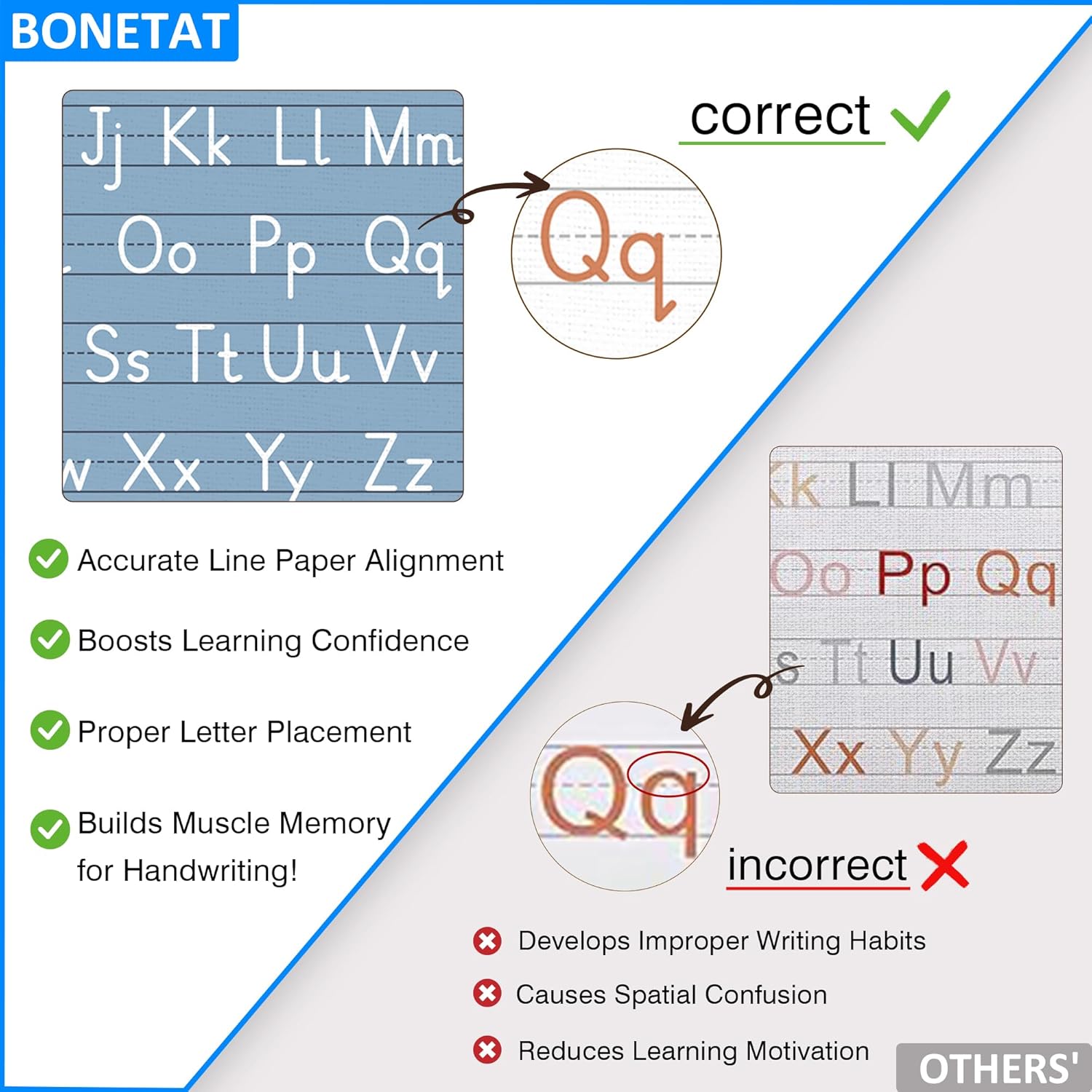 - School-Standard Letter Design: Every alphabet follows "proper line paper guidelines" β uppercase letters touch the top line, lowercase letters fit between midlines. Teaches correct stroke order and prevents common reversals (b/d/p/q). Give Your Child a Head Start in Handwriting!