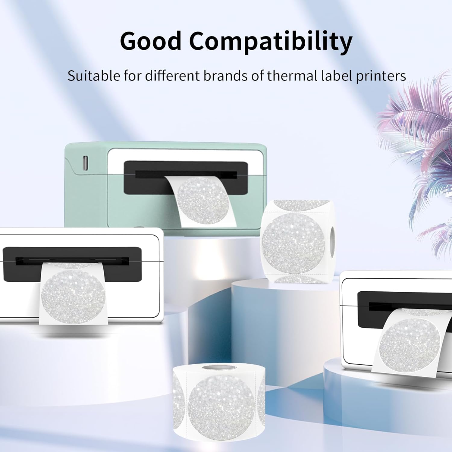 2" Holographic Thermal Label Stickers, Round Direct Thermal Label Stickers, Glitter Thermal Printer Sticker Labels for Gift Wrapping, Self-Adhesive Custom Logo Design- Glitter Silver
