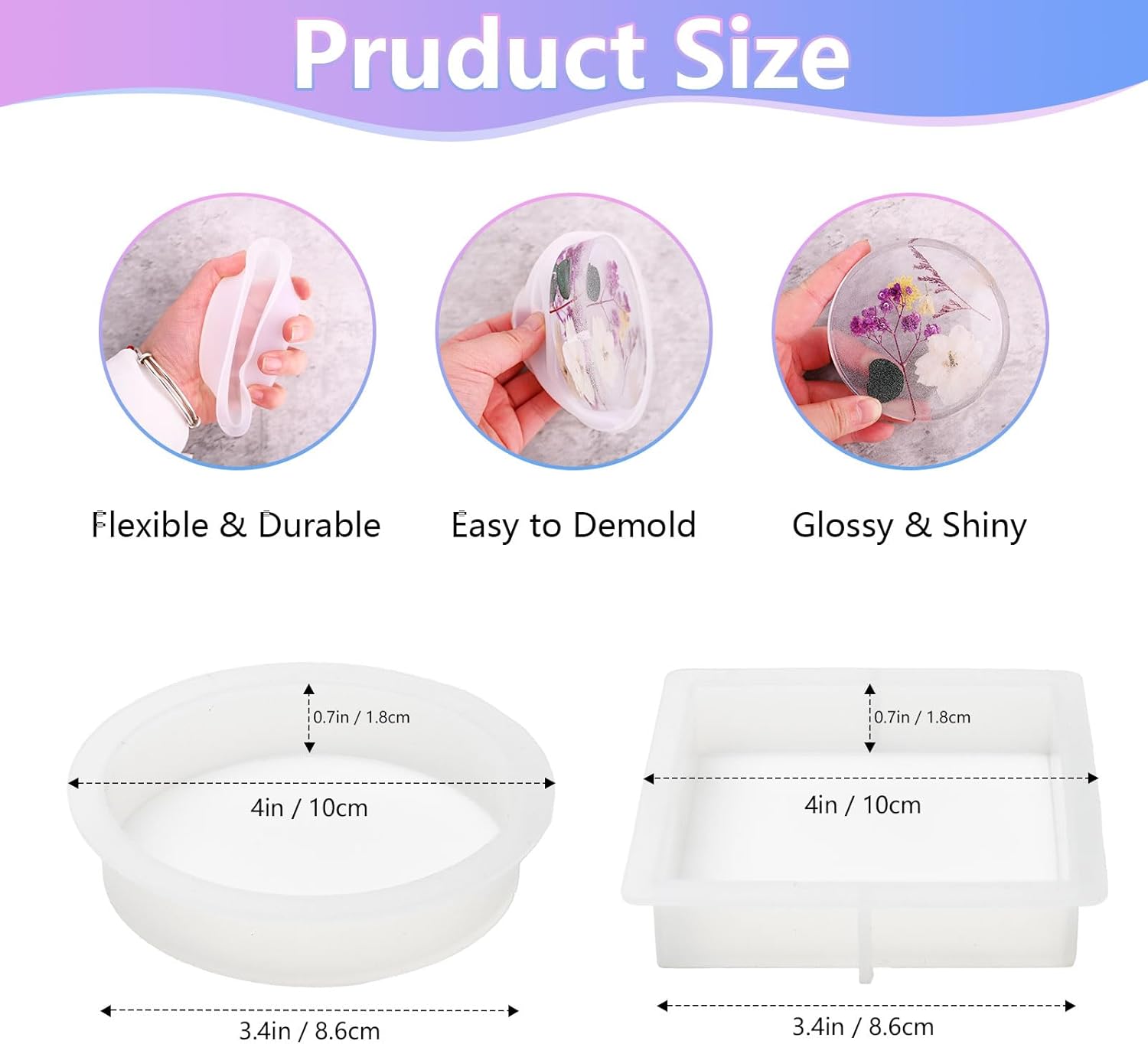 - What You Get: Includes 4 reusable round (3.81” diameter) & 4 square (3.81” sides) silicone molds with 0.86” depth. Durable, warp-resistant design creates professional resin coasters at home. Perfect for creating professional-grade resin coasters
