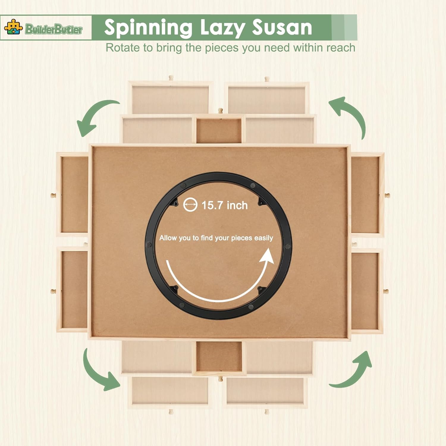 - Spinning Lazy Susan Design: The BuilderButler rotating puzzle board features a smooth Lazy Susan mechanism, allowing for effortless 360Β° rotation. This innovative swivel system lets you easily reach any section of your puzzle without moving around, enhancing both comfort and efficiency. The steady rotation provides a seamless puzzling experience, adding an extra layer of fun and strategic interaction, making it the perfect tool for puzzle enthusiasts.