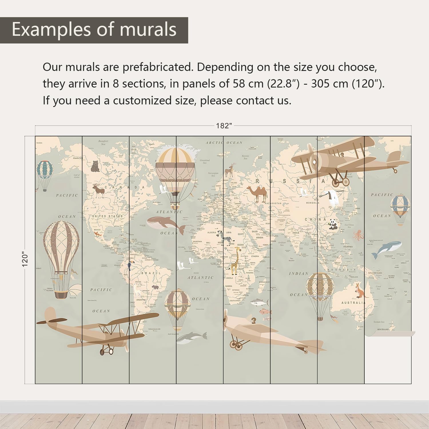 - Size note: Mural measures 182"W x 120"H and is divided into 8 sections, each section is labeled with a number underneath, eliminating the need to overlap patterns when installing.