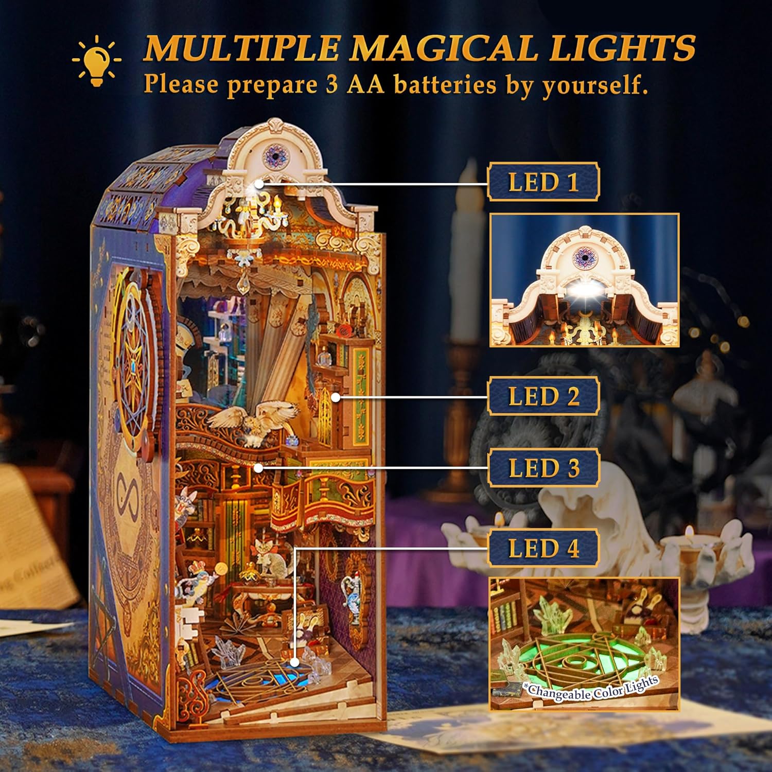 Tonecheer DIY Book Nook Kit for Adults, 3D Wooden Puzzle Bookend Miniature House Kit, Booknook Bookshelf Insert Decor with Dust Cover and LED Lights Gifts (Magical Library)