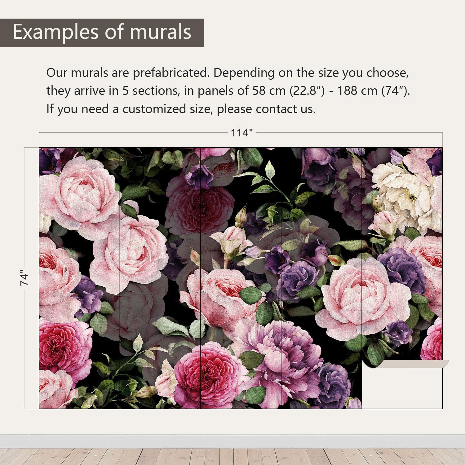 - Size note: Mural measures 114"W x 74"H and is divided into 5 sections, each section is labeled with a number underneath, eliminating the need to overlap patterns when installing.