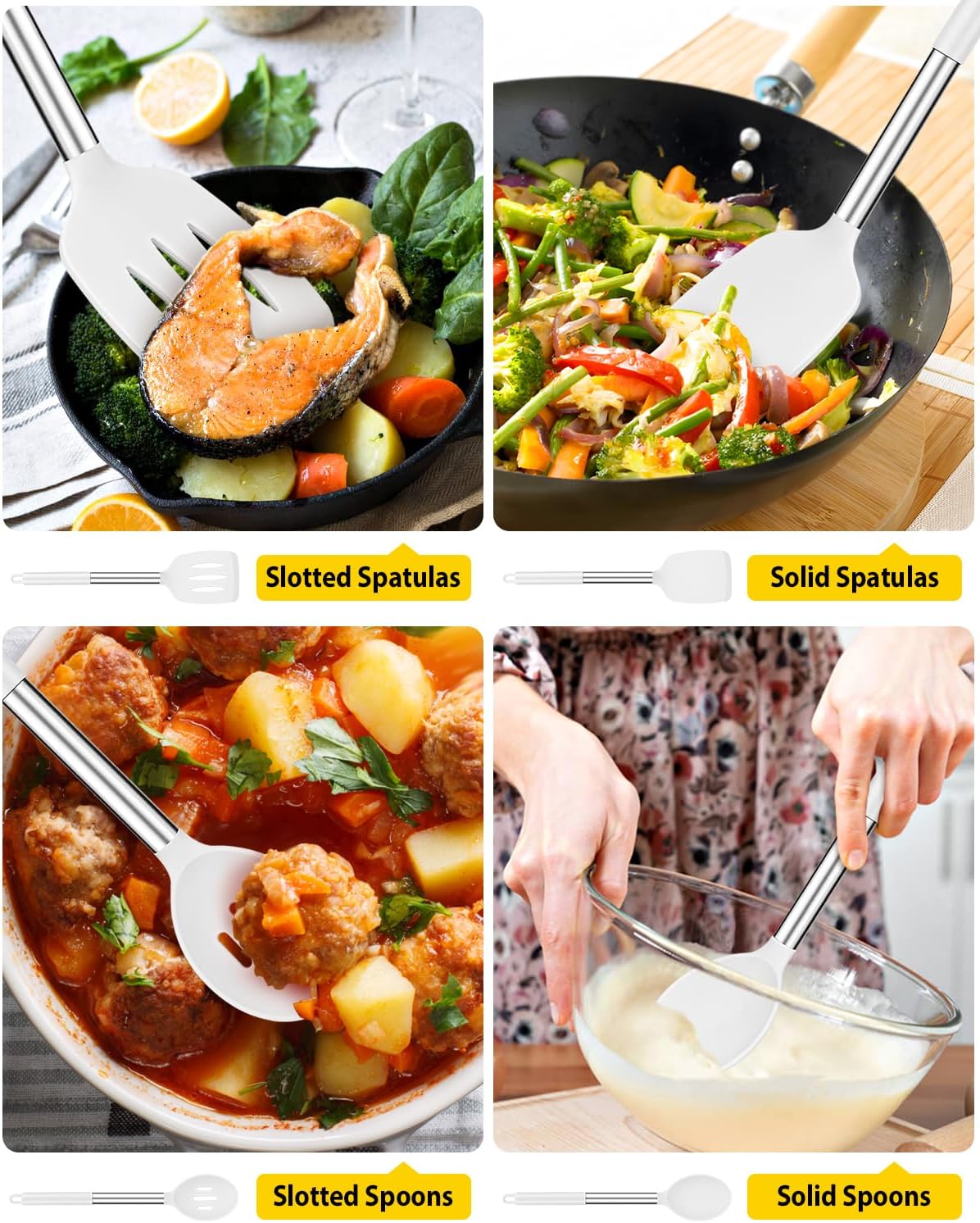 Pack of 4 Silicone Cooking Utensils Set, Non Stick Large Solid Spatulas, Heat Resistant Slotted Spoons, Ideal BPA Free Kitchen Turners for Frying, Mixing,Serving,Draining,Turning,Stirring (WHITE)