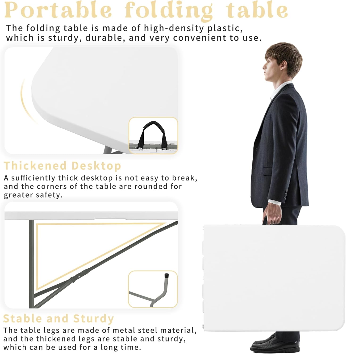 - 6 FT Folding Tables: You will receive heavy-duty folding tables measuring 6 ft/70.9 inches in length, 2.3 ft/27.6 inches in width, and 2.4 ft/29.1 inches in height. The tabletop of the table is made of high-density polyethylene material, and the support and legs of the table are made of high-quality metal steel, which is not only sturdy and durable, but also structurally stable and not easy to shake.