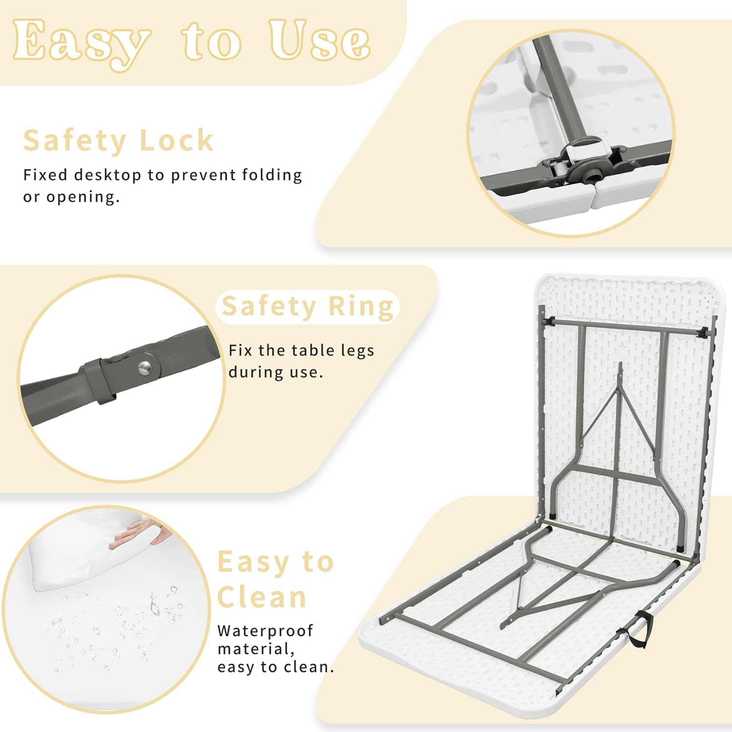 - Multi Functional Outdoor Table:The surface of this folding table is smooth and sturdy, easy to wipe, and the table corners are designed with rounded corners for safety and reliability. The anti slip covers on the four table legs prevent the table from shaking freely and protect the floor from scratches. Each table can accommodate 4-8 people, making it the best choice for outdoor camping, indoor activities, picnics, offices, birthday parties, banquets, weddings, craft fairs, kitchen table, and other events.