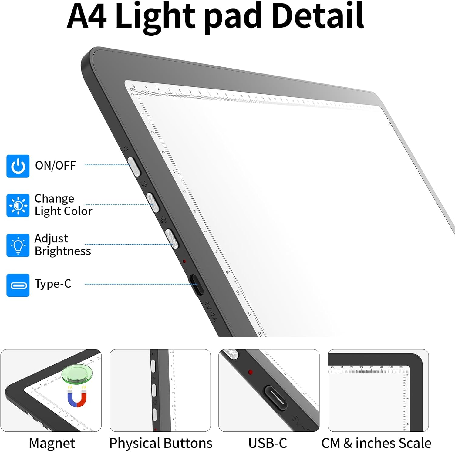 - 【 Standard A4 size, CM-INCH double scale 】 This super bright lightpad Overall Size is 35.2 x25.4 x 0.9 cm ( 13.9 x 10.0 x 0.35 inches ), and the visual working area is 31.6 x 21.8 cm ( 12.5 x 8.6 inches ). Illuminated area large enough for international standard A4 paper. This Light Drawing Sketch Pad has a dual scale of centimeters and inches to meet your various usage habits.